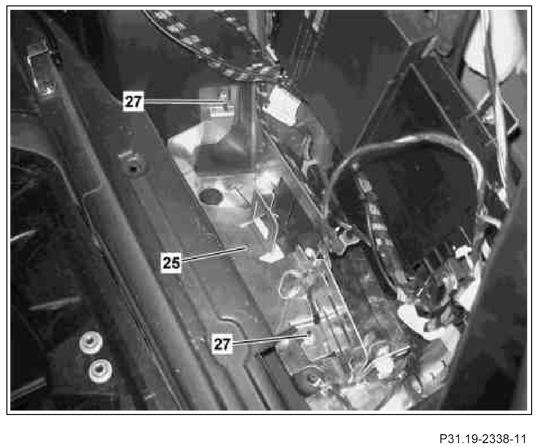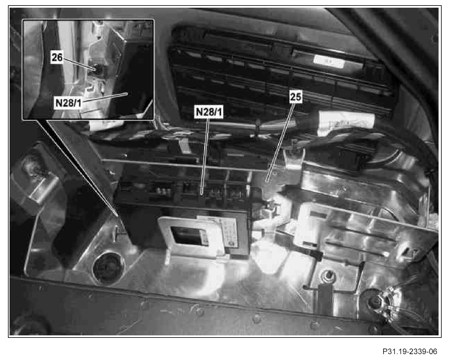 2. Insert trailer recognition control unit (N28/1) into bracket (25) and fasten in place using plastic clip (26).