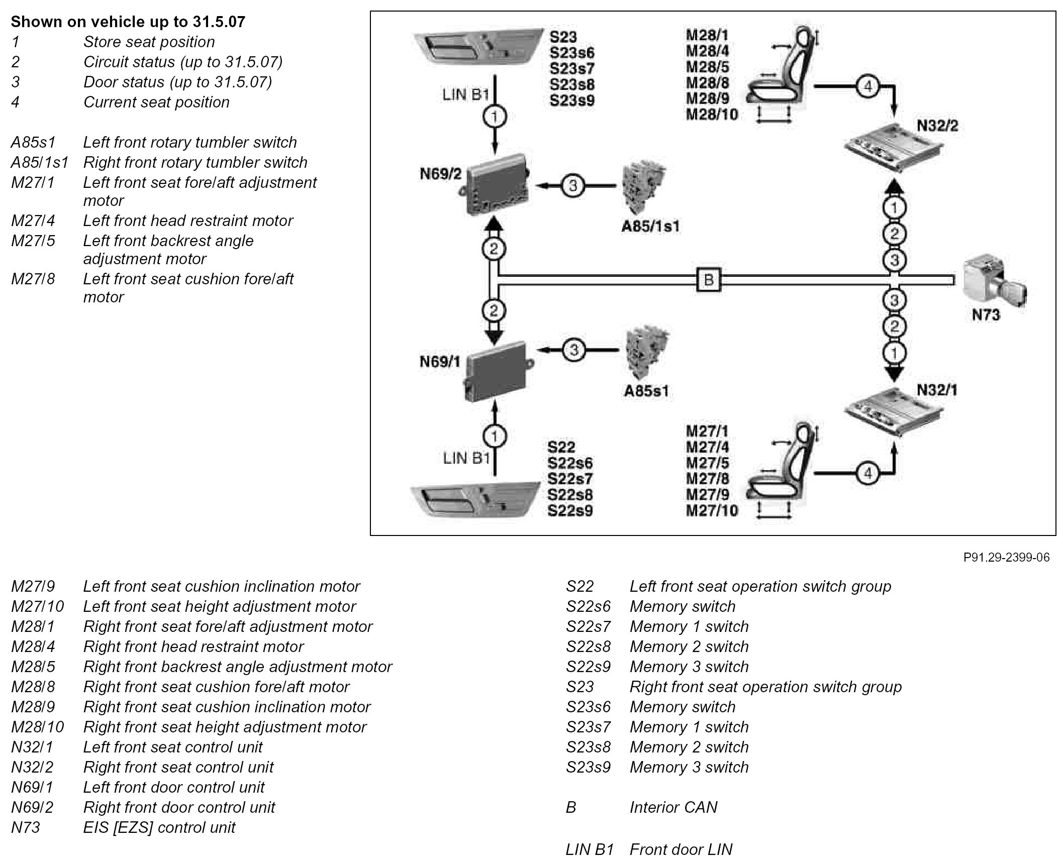 The request is read in over the front door LIN from the respective door control unit and placed on the interior CAN. The seat settings are stored in the respective seat control unit.
