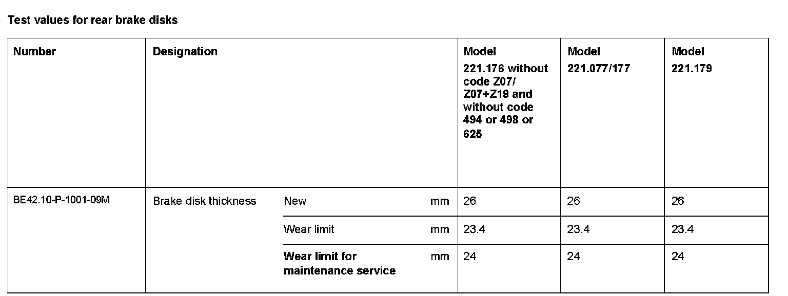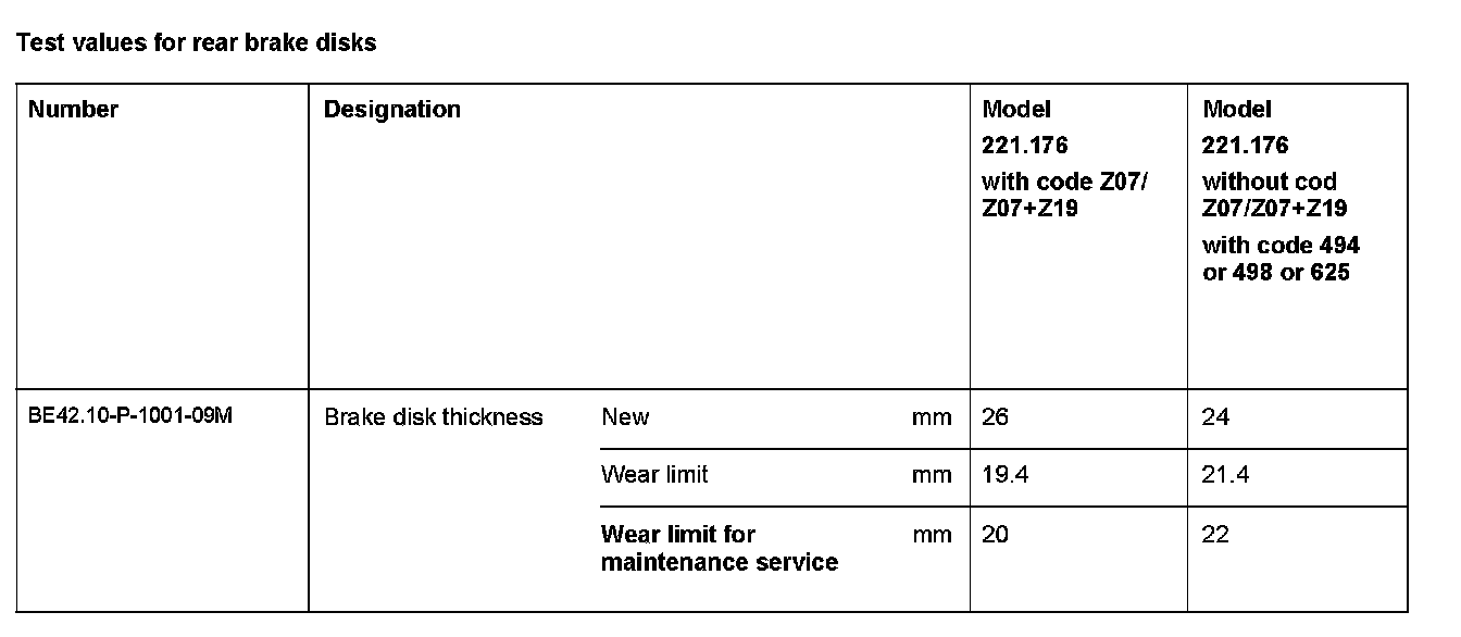 BE42.10-P-1000-09M Test values for rear brake disksTest Values For Rear Brake Disks: