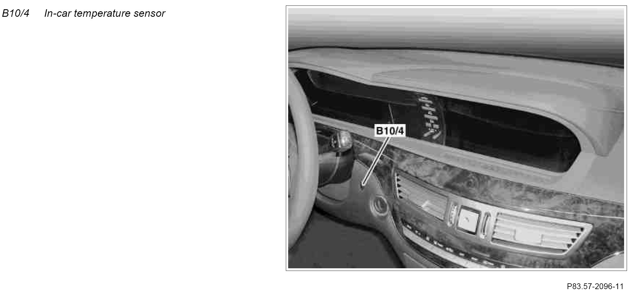 The in-car temperature sensor consists of a temperature dependent resistor which changes its resistance value as the temperature changes. This value is used by the AAC [KLA] control unit (N22/1) to calculate the temperature in the vehicle interior.