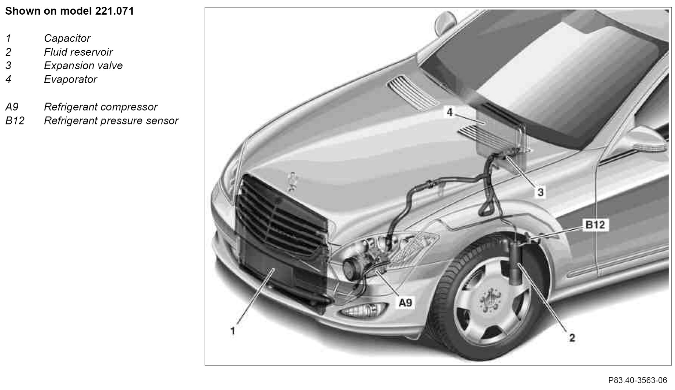 The refrigerant's compression heat is then withdrawn on the surface of the condenser. The refrigerant liquefies during cooling. If cooling by the airstream is not sufficient, air is additionally drawn in by the engine and air conditioning electric suction fan with integrated control (M4/7) to cool the condenser.