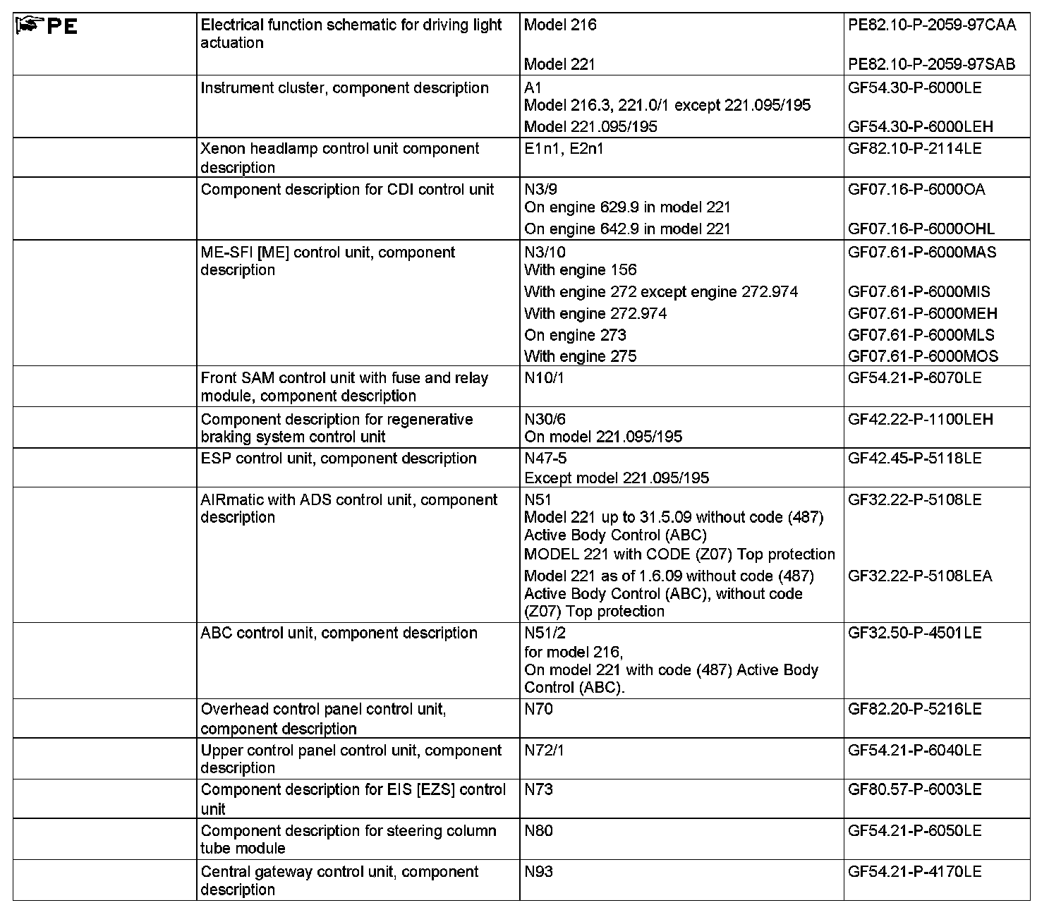 Model 216, model 221 up to 31.5.09, model 221 as of 1.6.09 without code (615) Bi-xenon headlamp unit with integrated curve illumination and without code (616) Xenon headlamp unit with asymmetrical integrated curve illumination and without code (621) Intelligent Light System (left-hand traffic) and without code (622) Intelligent Light System (right-hand traffic):