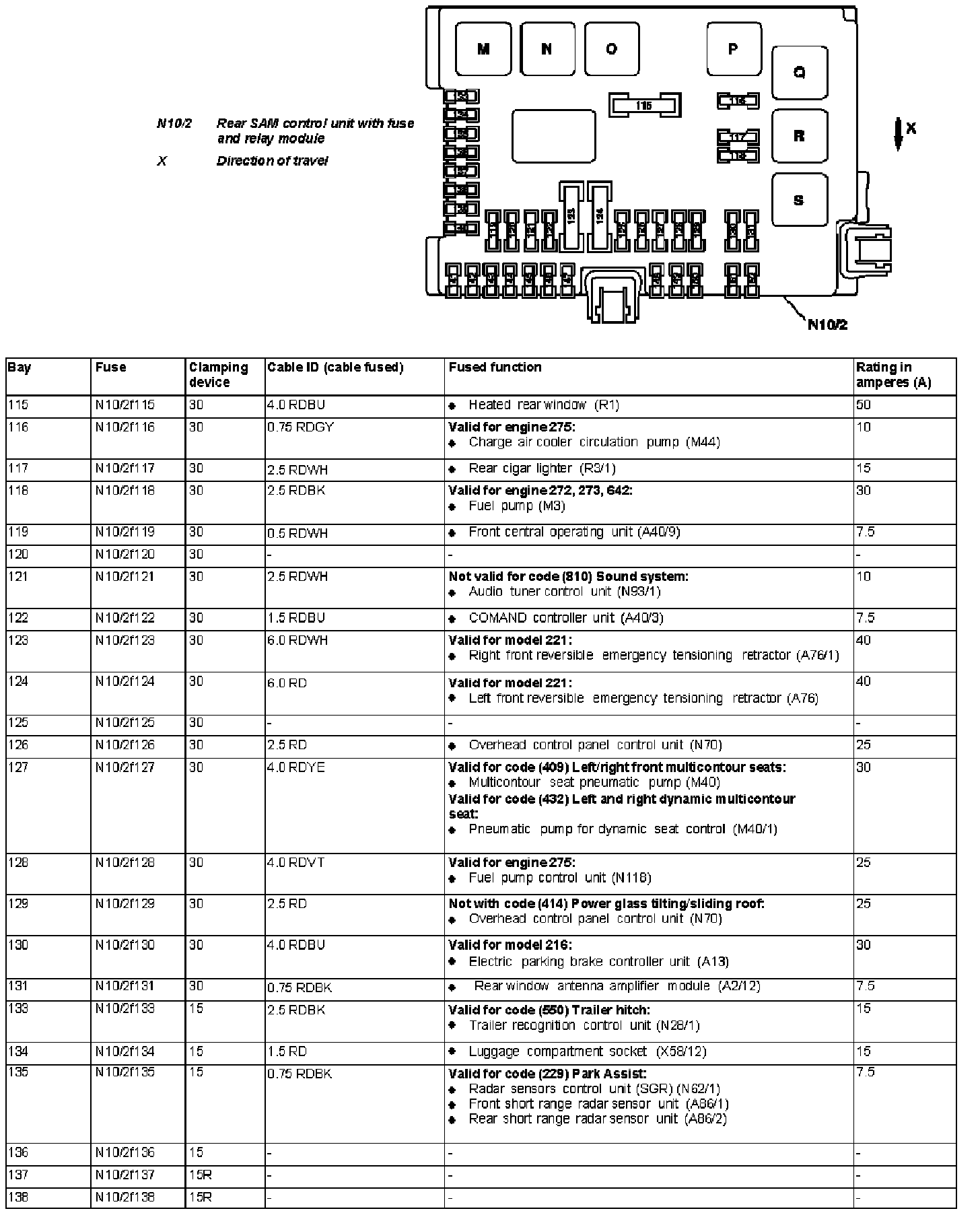 Fuse assignment of fuse and relay box in trunk