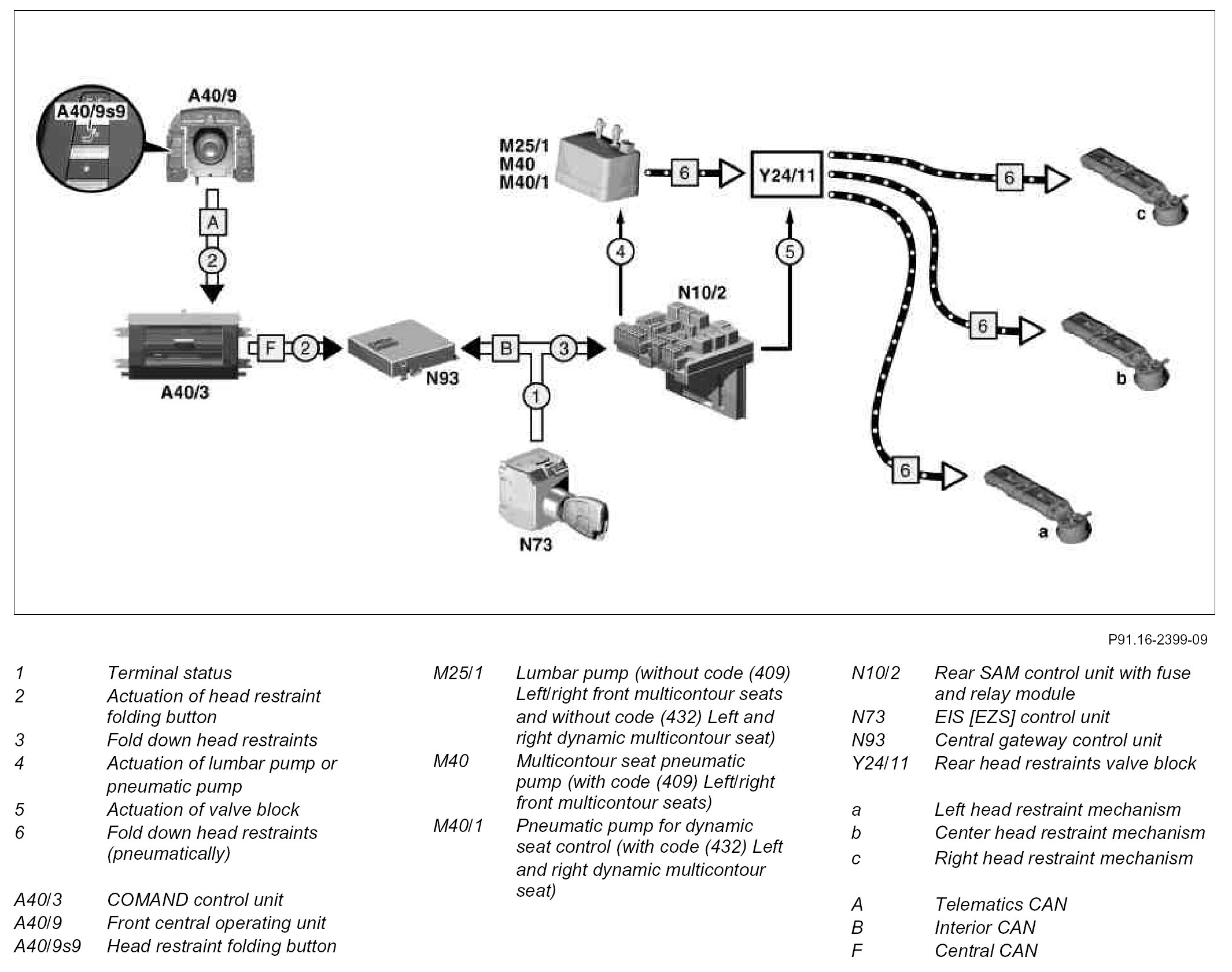 When the head restraint folding button in the front central operating unit is pushed forwards, the rear SAM control unit receives the message for folding down the rear head restraints via the interior CAN.