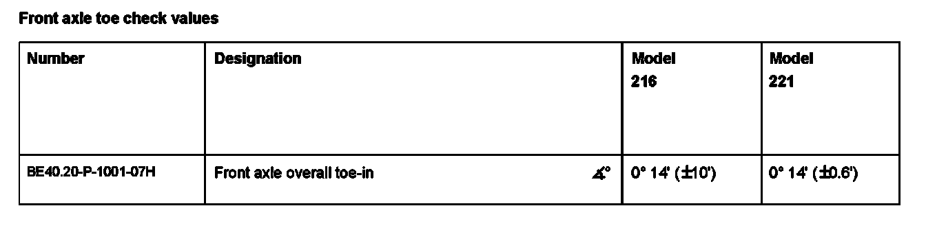 Front axle toe check values:
