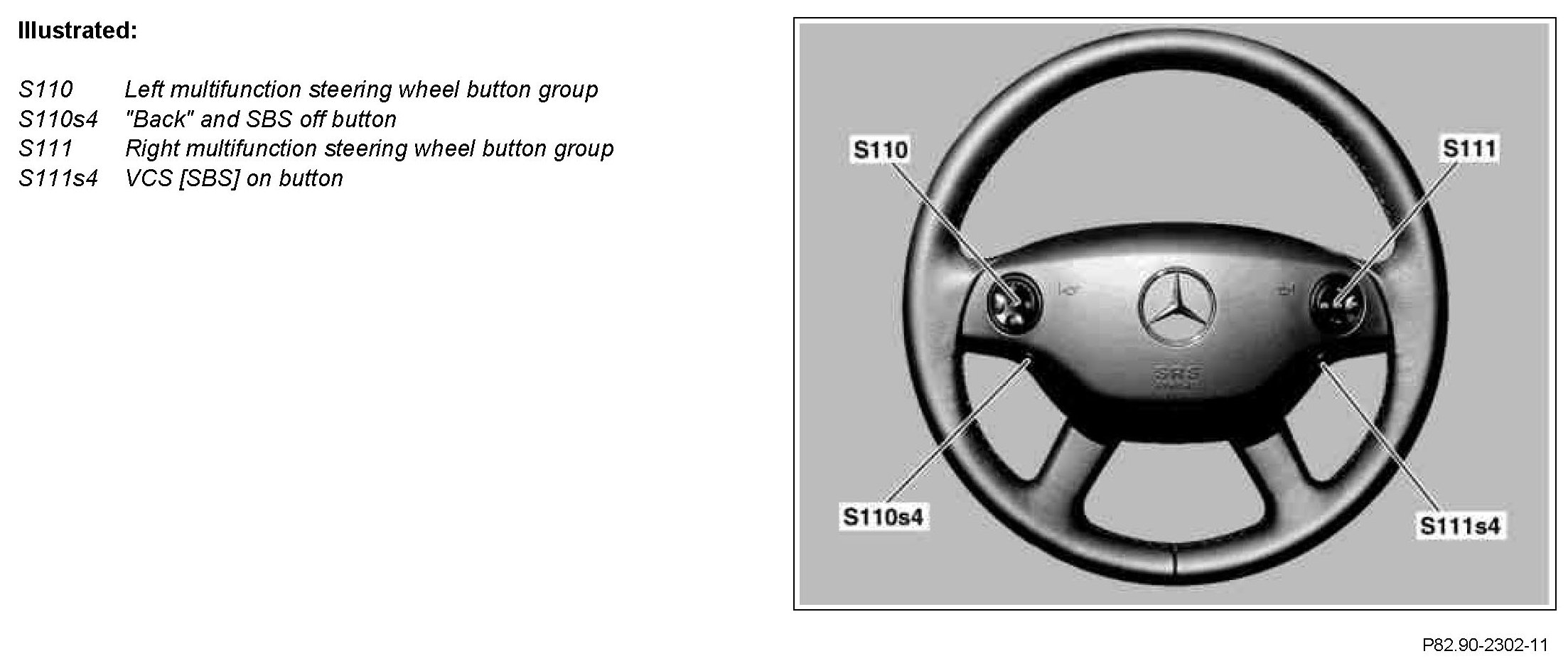 The button groups and buttons in the multifunction steering wheel can be used to operate the displays and menus in the multifunction display (A1p13) of the instrument cluster (A1) and to accept telephone calls. The VCS [SBS] on button and "back" and SBS off button can be used to switch the voice control system on and off.