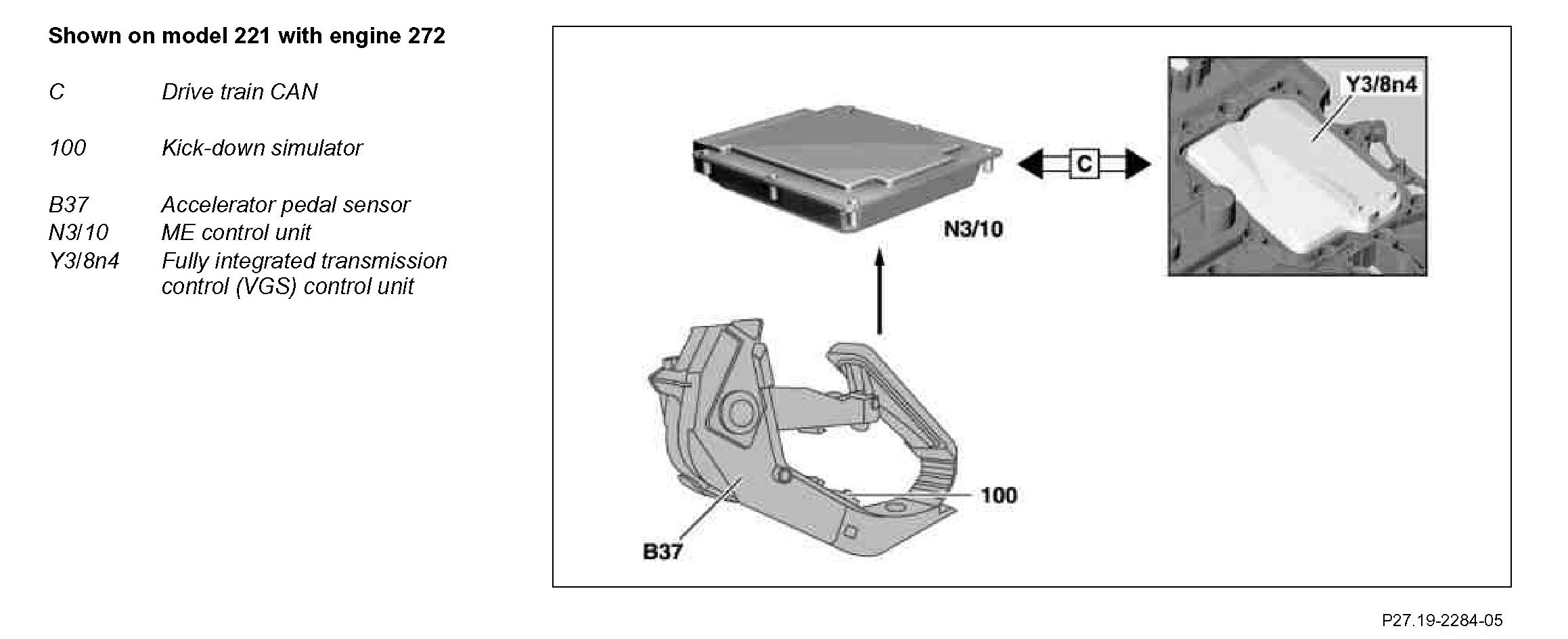 The "Kick-down" signal is recorded by the accelerator pedal sensor, read in by one of the following control units and passed on via the drive train CAN to the fully integrated transmission control (VGS) control unit: