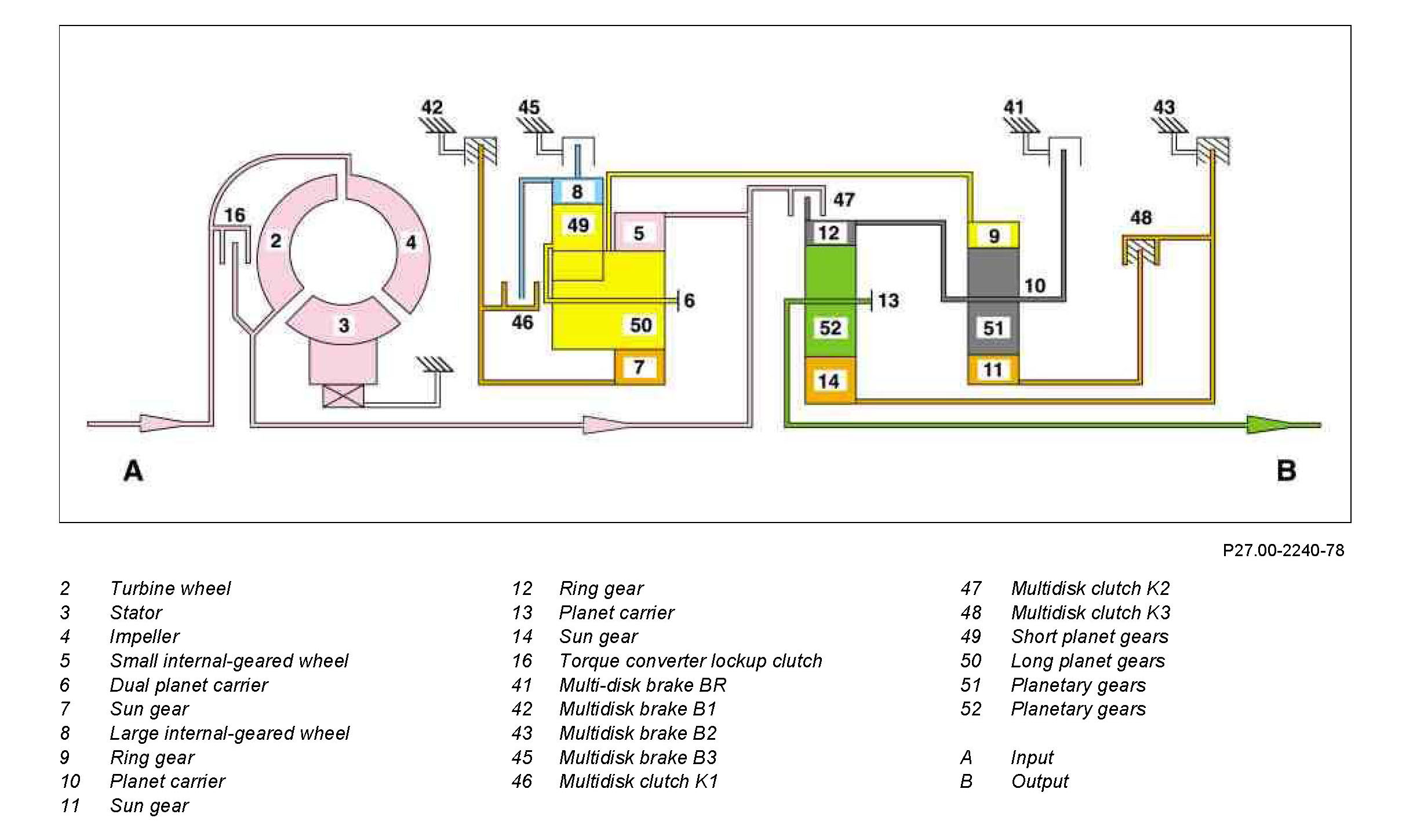 The internal-geared wheel (12) has a mechanical connection to the planet carrier (10) and rotates at the same speed. The planetary gears (52) roll on the stalled sun gear (14) and transfer the increased torque and reduced rotational speed to the transmission output shaft via the planet carrier (13). The transmission output shaft thus rotates with reduced transmission input speed in the direction of rotation of the engine.