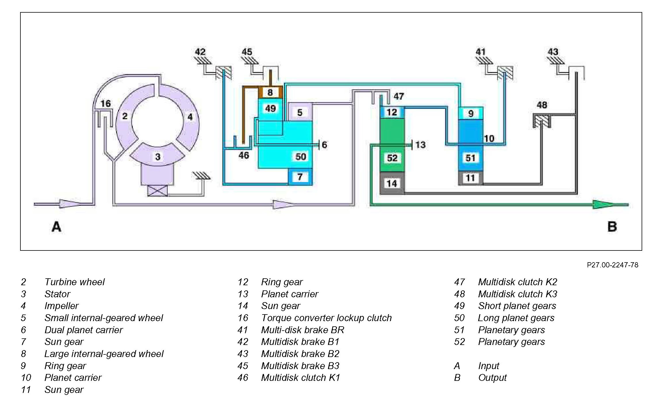 There is a connection between sun gear (14) and sun gear (11) via the engaged multidisk clutch K3. As a result sun gear (14) rotates at the same speed and direction of rotation as sun gear (11) and drives the planetary gears (52). The increased torque and reduced rotational speed as a result are transmitted via the planet carrier (13) to the transmission output shaft. The transmission output shaft thus rotates at reduced transmission input speed opposite to the direction of the engine.