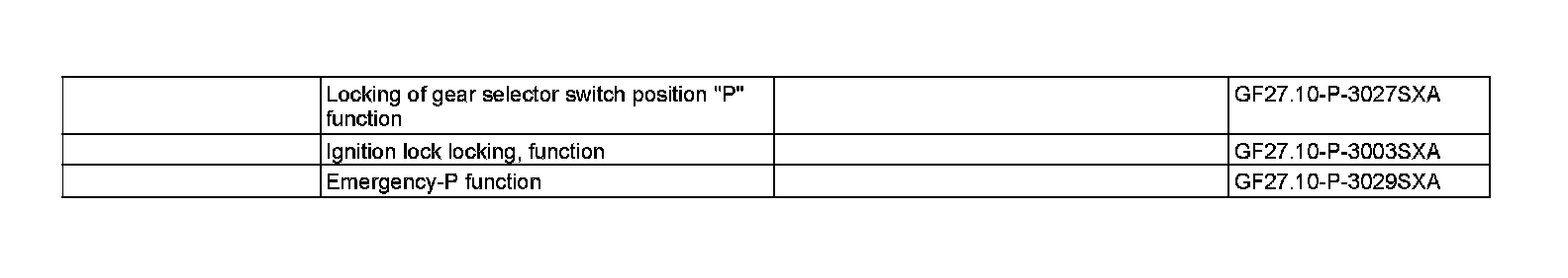 Key-P is used to summarize the functions which serve to prevent the vehicle from inadvertently rolling away in addition the parking brake. These include locking of the gear selector switch position"P", locking of the mechanical part in the EIS [EZS] control unit (N73) as well as the park pawl in the transmission. The function Key-P only permits switching out of gear selector switch position "P", if the transmitter key (A8/1) has been turned into position "circuit 15 ON" and the brake pedal is pressed.