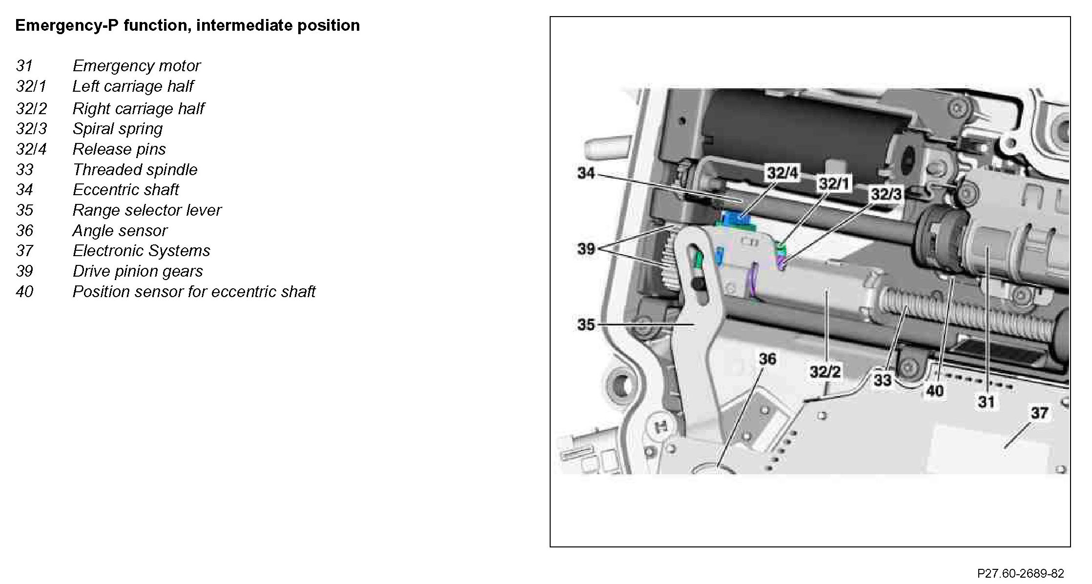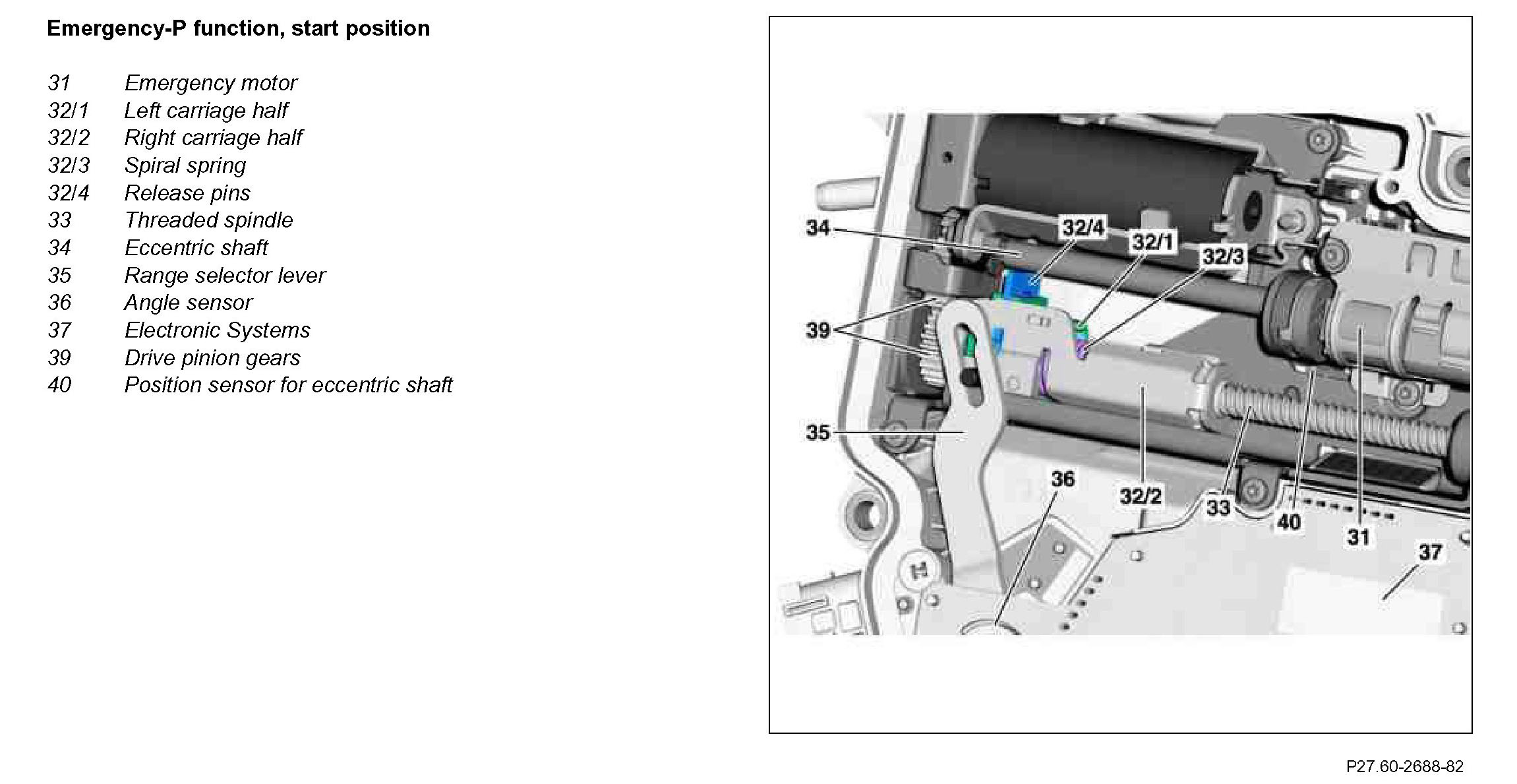 The emergency P-function is automatically overridden, if the emergency case, which, e.g. is caused by under voltage in the on-board electrical system, is no longer given. The main motor drives the threaded spindle by way of the drive pinion gears. The left carriage half runs on to the right carriage half, the coil spring is pre-compressed again and the mechanical connection made again.
