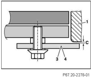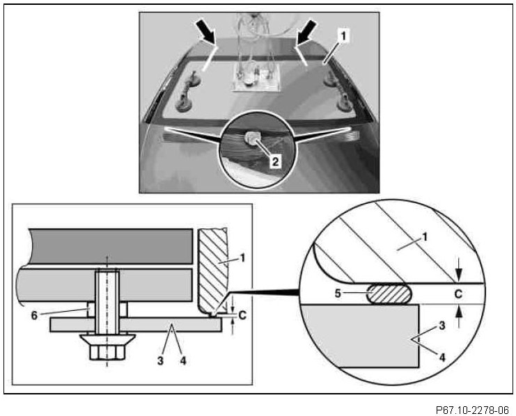 Ensure that the transition between the windshield (1) and front edge of the roof is flush or does not deviate more than 1 mm upward or downward. If the gap dimensions (C) cannot be achieved while maintaining the transition between the windshield (1) and front edge of the roof, it is necessary to adjust the appropriate gap dimensions C) by removing or replacing the spacer washers (6) (see separate repair instructions).
