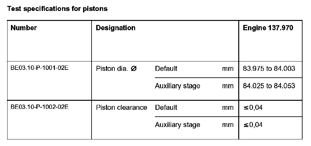 No piston with a standard diameter in should be installed in a cylinder bore with identification 0 to avoid engine damage. This can result in the following combinations: