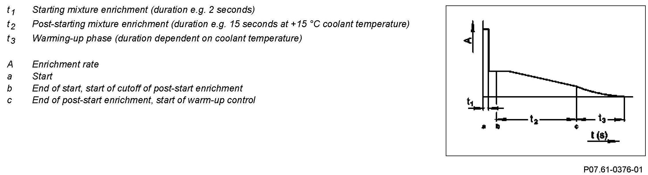 Post-start enrichment compensates for the fuel which precipitates on the cylinder walls. It is enriched sufficiently until a certain engine speed has stabilized (e.g. 1400 rpm with no gear engaged at +30 °C coolant temperature for about 30 s).