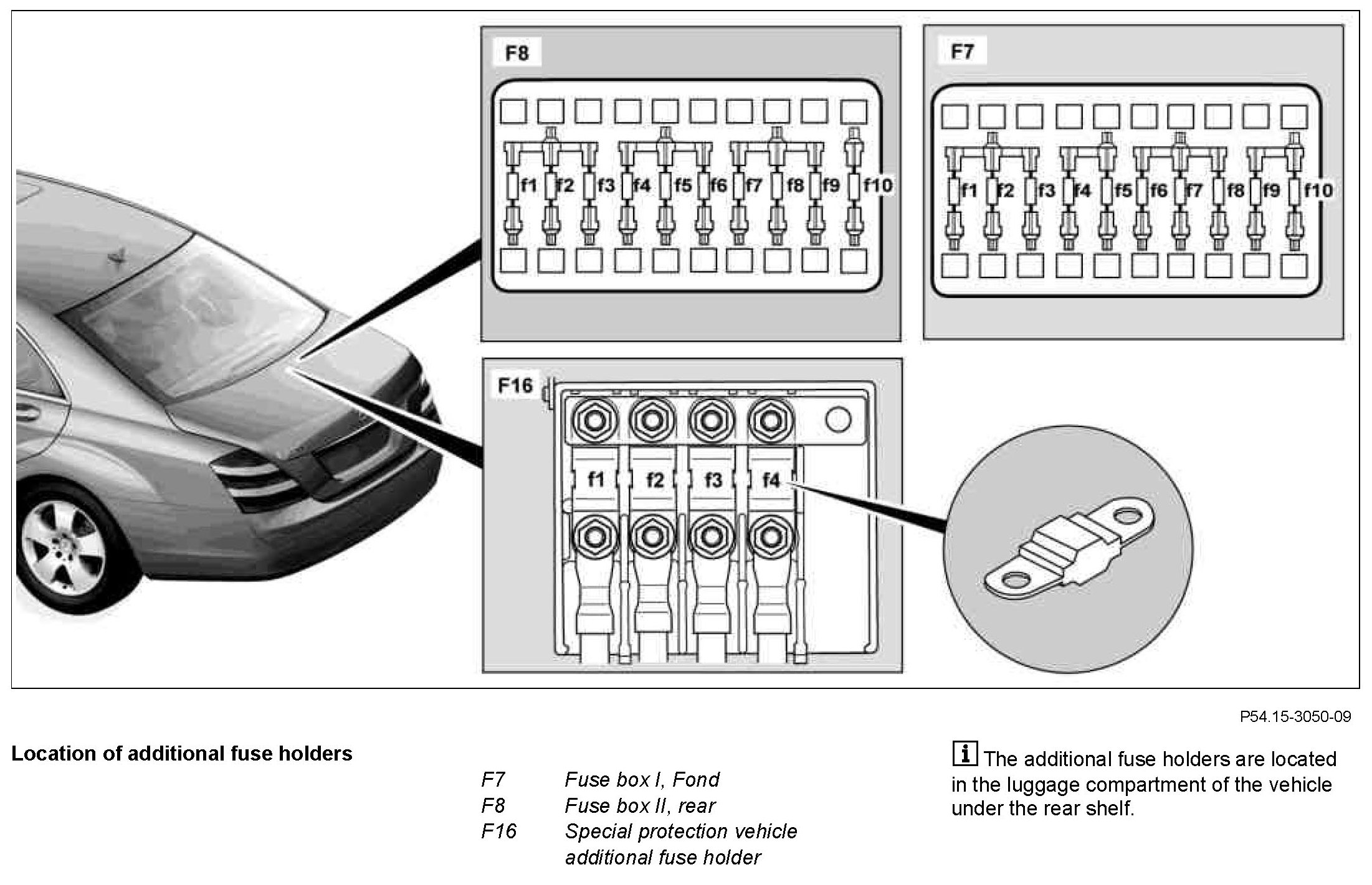 The additional fuse holders are located in the luggage compartment of the vehicle under the rear shelf.