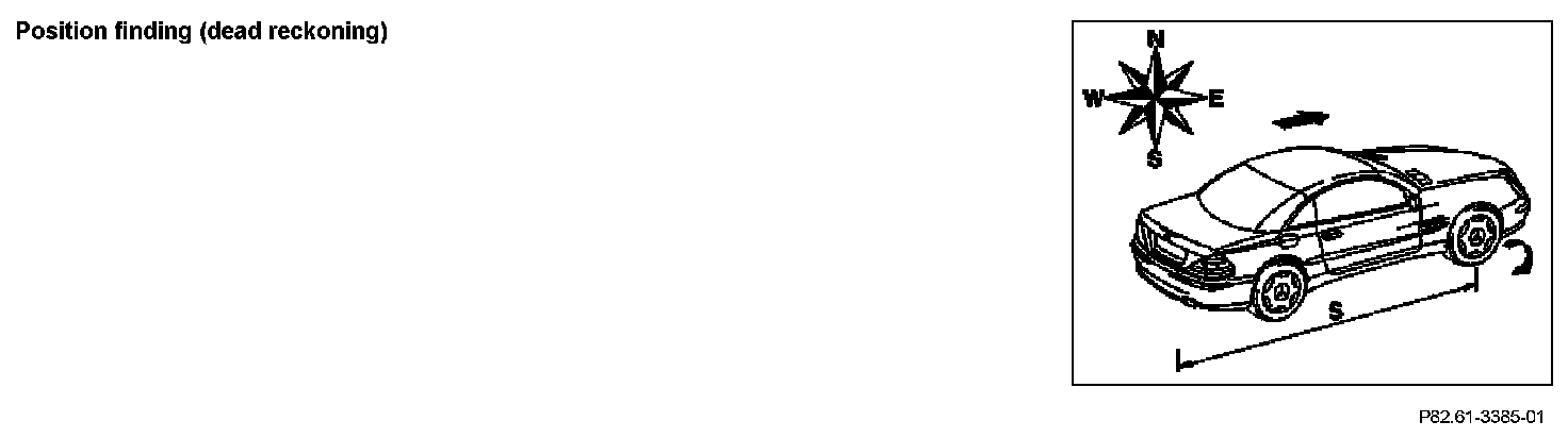 Basic location finding (dead reckoning) is the basic function of continuous location finding. When the ignition is switched on, it is carried out continuously by the navigation processor (N41/1) and is independent of the digital versatile disk (DVD) map. The current position is stored after the ignition is switched off. The following information is calculated with the aid of basic position finding (composite positioning):