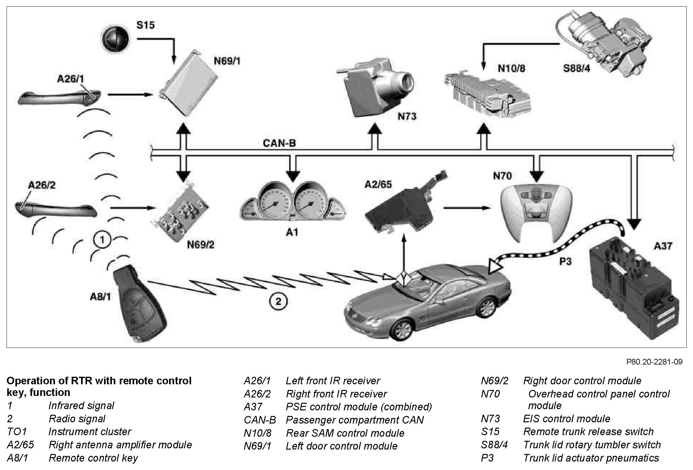 By pressing the trunk lid emergency opening switch (S88/10), it is possible to open the trunk lid inside from the of the trunk emergency in an (e.g. persons trapped). The pneumatic control module with combined functions (A37) reads in the switch voltage-coded and opens the trunk lid pneumatically irrespective of whether the trunk lid was closed manually locked or whether the vehicle was centrally.