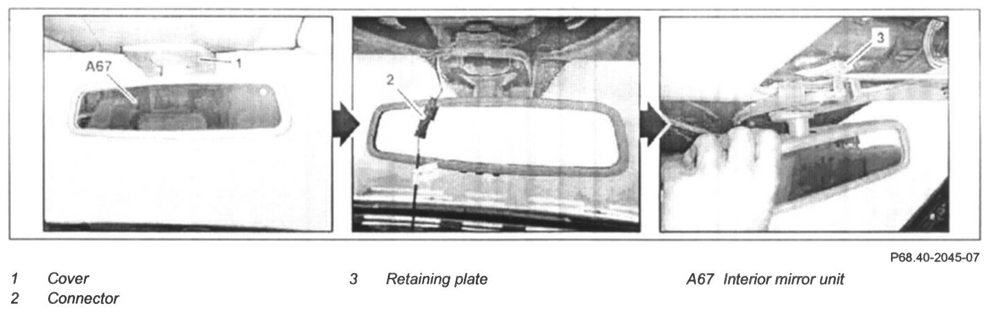 4 Position screwdriver between inside rearview mirror (A67) and retaining plate (3) and pry off inside rearview mirror (A67)