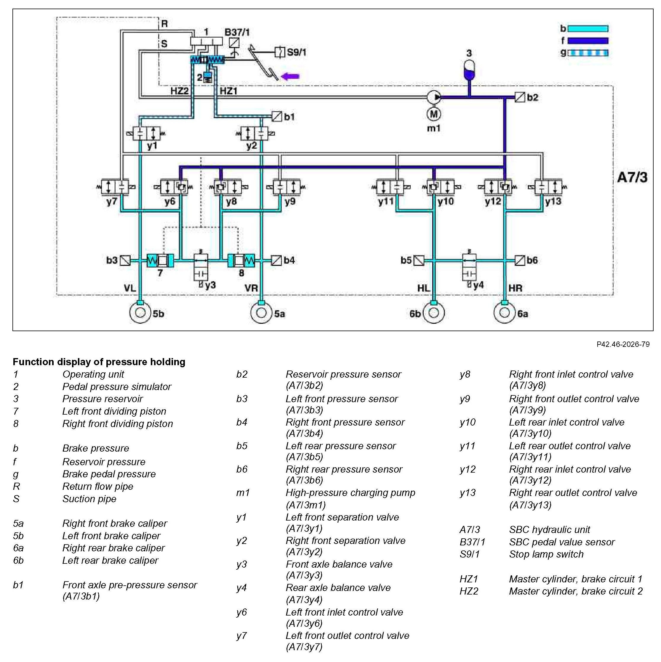 As soon as the computed brake pressure is reached, the left front inlet control valve (A7/3y6), right front inlet control valve (A7/3y8), left rear inlet control valve (A7/3y10) and right rear inlet control valve close (A7/3y12).