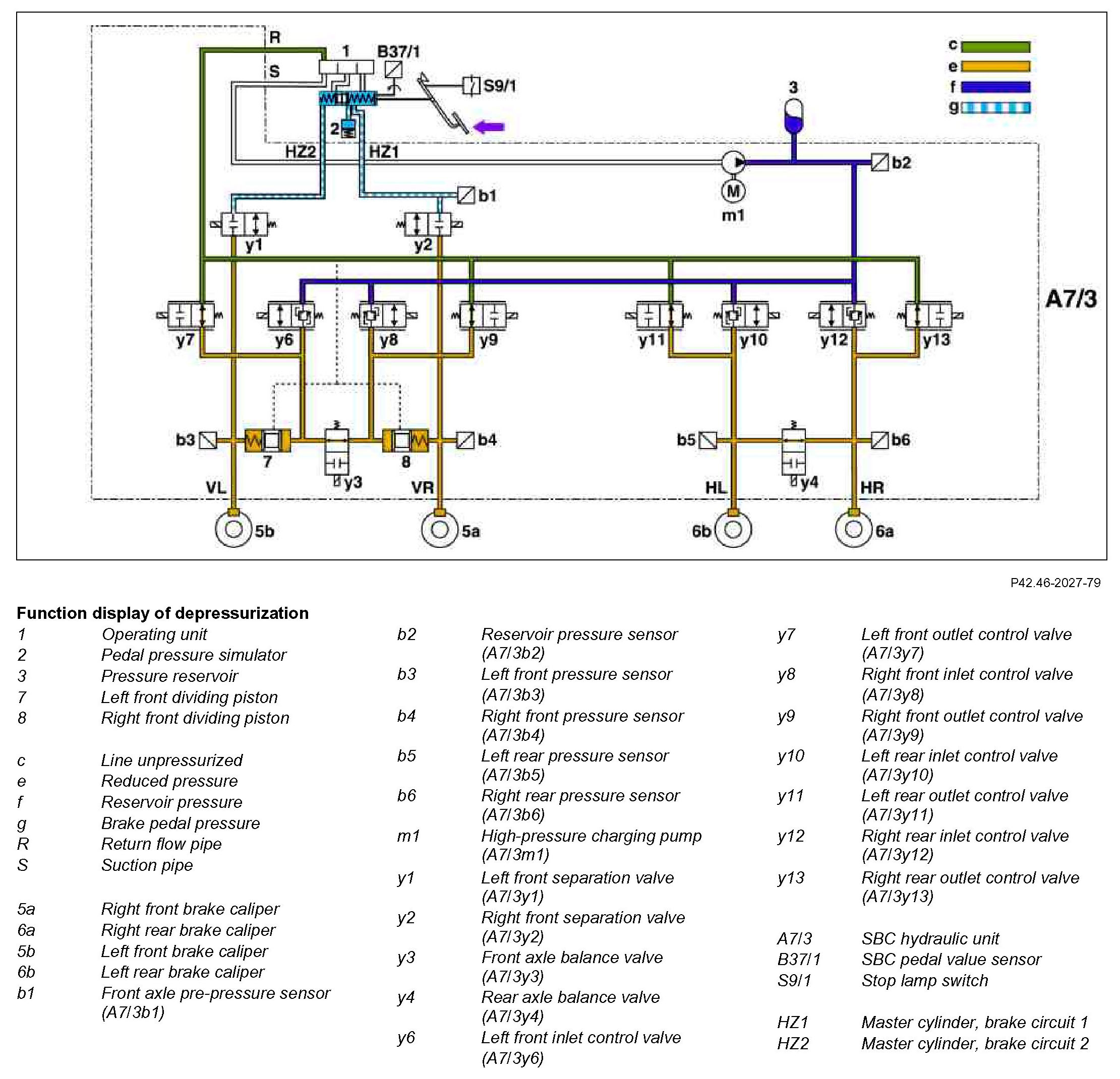 The ESP, SPS [PML] and BAS control unit (N47-5) calculates the brake pressure. The specified data are passed on to the SBC control unit (A7/3n1) and this starts with the control in the SBC hydraulic unit (A7/3).