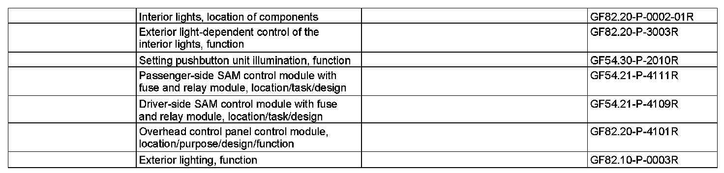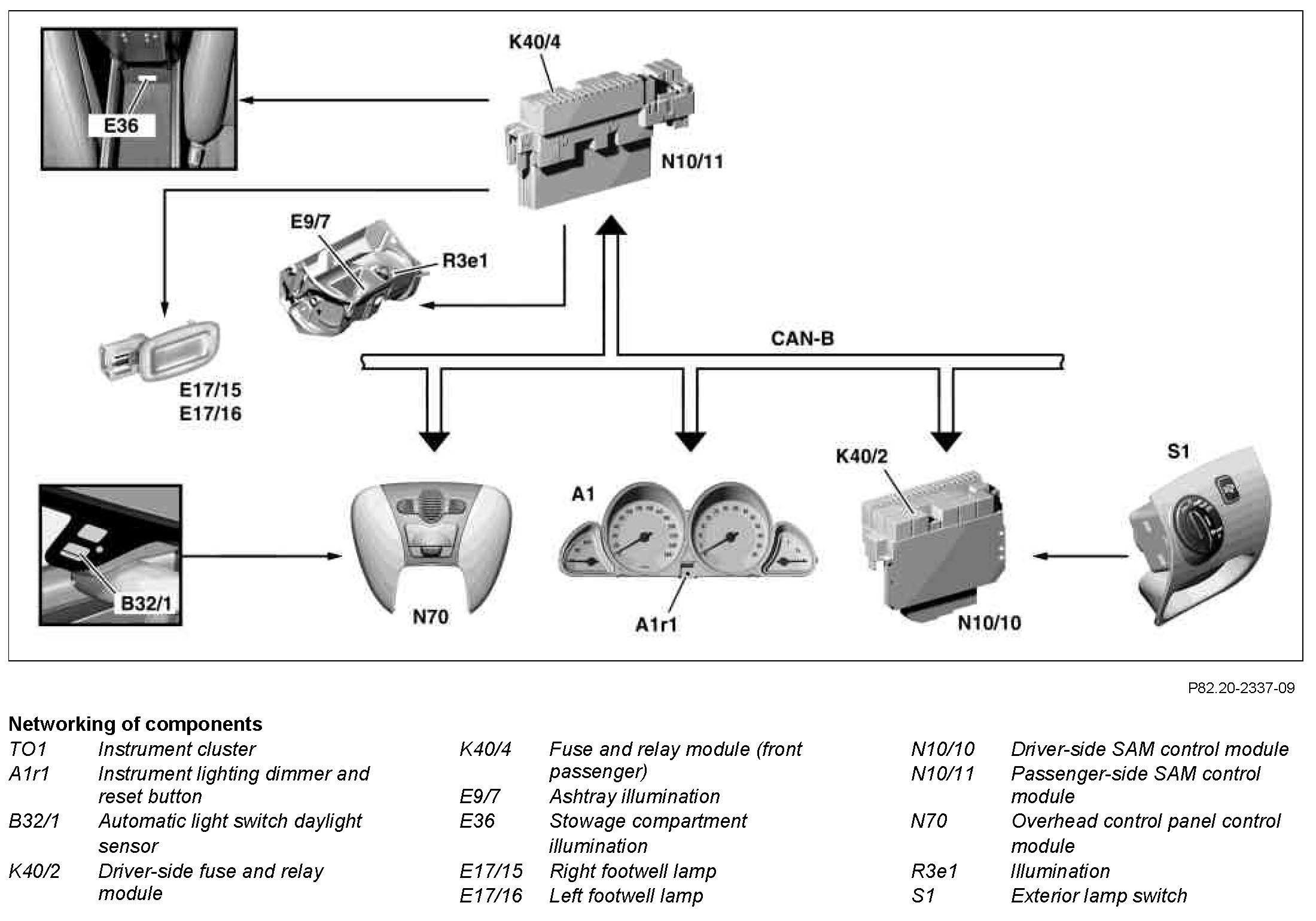 The lamps are actuated by the passenger-side SAM control module (N10/11). The control module actuates the lamps as soon as the CAN message on/off ratio circuit 58d > 5% is received from the instrument cluster (A1). The lamps cannot be dimmed.