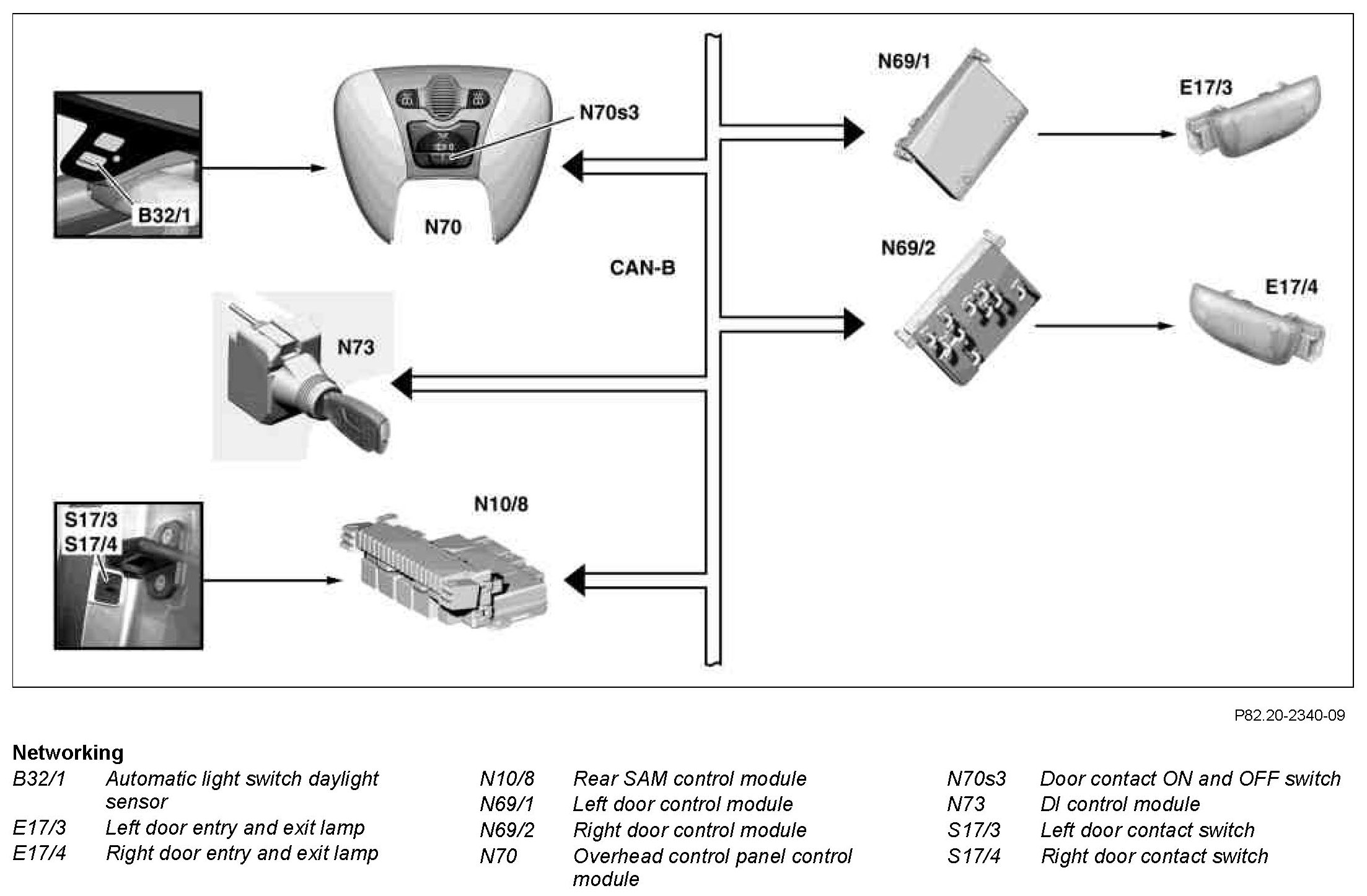 The entry/exit lamps are actuated by the relevant door control module (N69/1, N69/2).