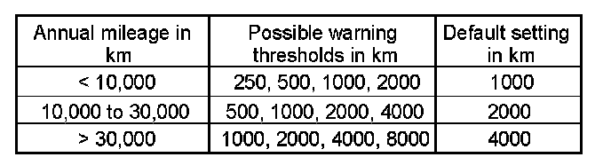 This warning threshold is set differently for 3 different mileages. By determining the daily mileage, the system adjusts itself to the correct annual mileage (see chart).