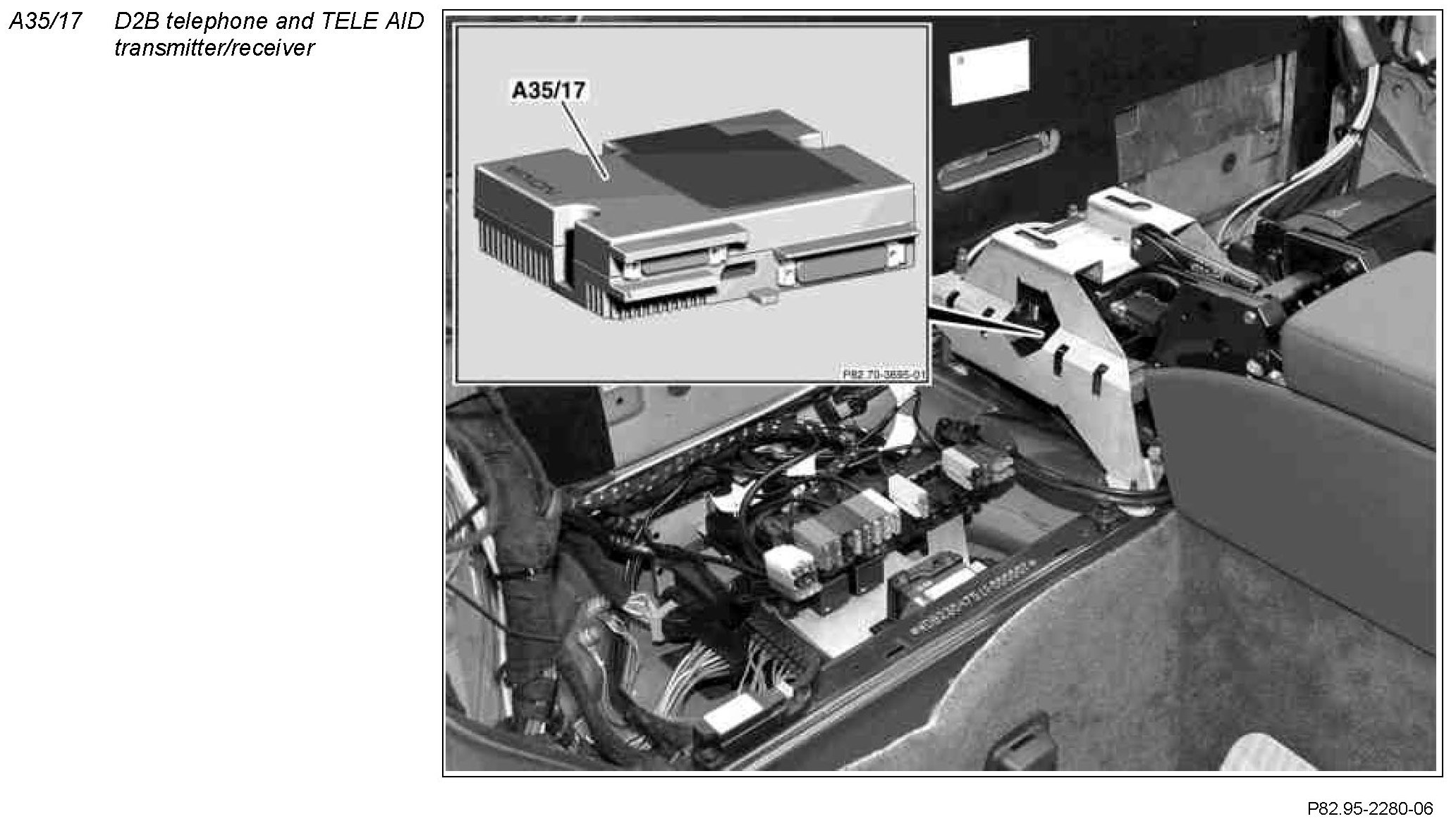The D2B telephone and TELE AID transmitter/receiver is located on drive shaft tunnel behind the seats below the cover.