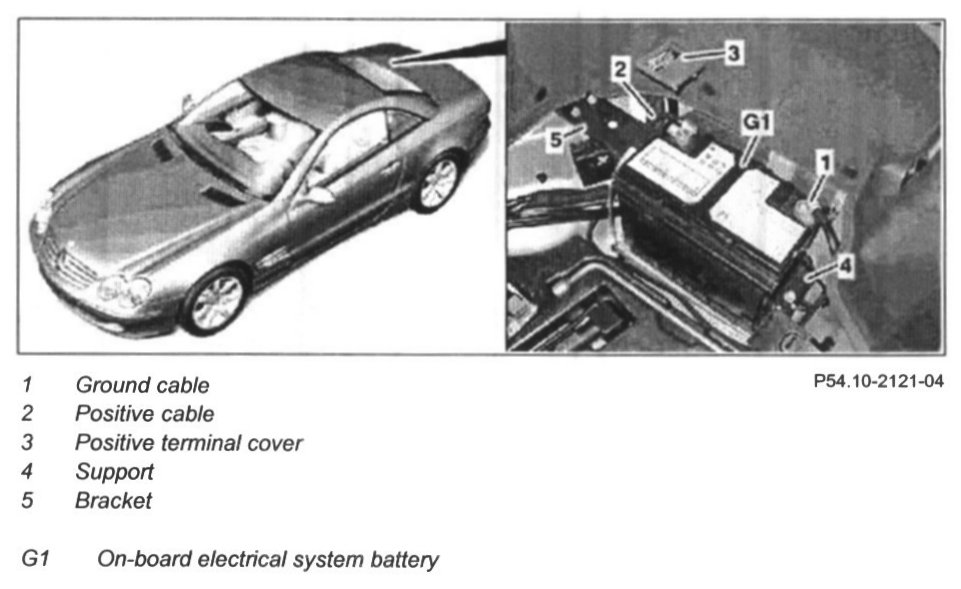 NOTE: First at the on-board electrical system battery (G1) in the trunk then at the starter battery in the engine compartment.