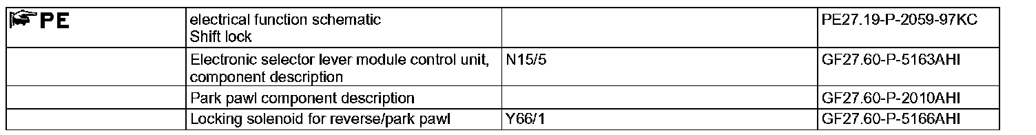 Upon receipt of a valid drive authorization code from the EIS control unit and a brake detection from the ESP, SPS [PML] and BAS control unit (N47-5) via engine compartment CAN (CAN C) the electronic selector lever module actuates the locking solenoid for the reverse/park pawl (Y66/1).