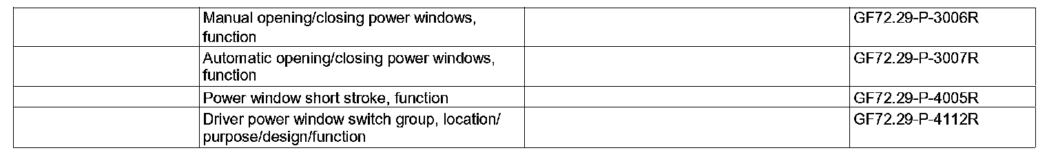 This function ensures that the doors and frameless side windows open and close without any problems. When the driver or passenger door is open, the relevant front and rear window is lowered by the short stroke position. So long as the short stroke is active, it is not possible to move the window up beyond the short stroke position, or to close it, also not with an operate request at the driver power window switch group (S20/1) or passenger power window switch(S21/2).