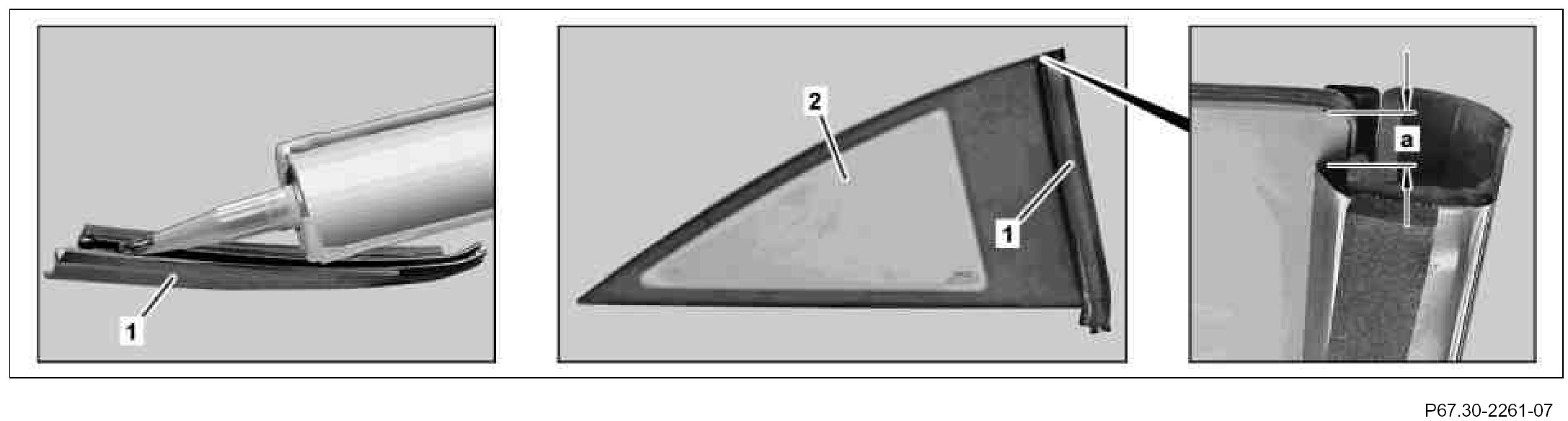 Sealing frame (1) must terminate approx. 2 to 4 mm (dimension a) below top edge of rear side window (2)