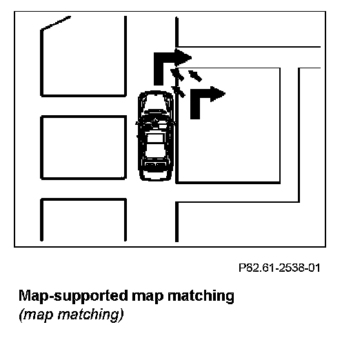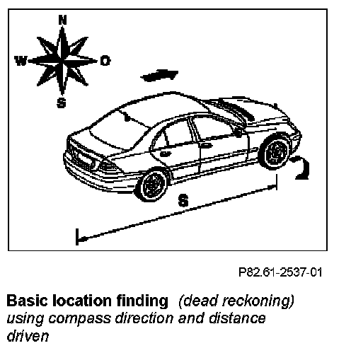 Continuous location finding means that the current position of the vehicle is calculated. It is active when the ignition is switched on and is accomplished by the navigation processor integrated into the COMAND operating, display and control module (A40/3). During the switch-on phase (software is loaded), only basic map matching is available. After switching the ignition off, all important positioning parameters are stored for the duration of the run-on time (approx. 30 min).