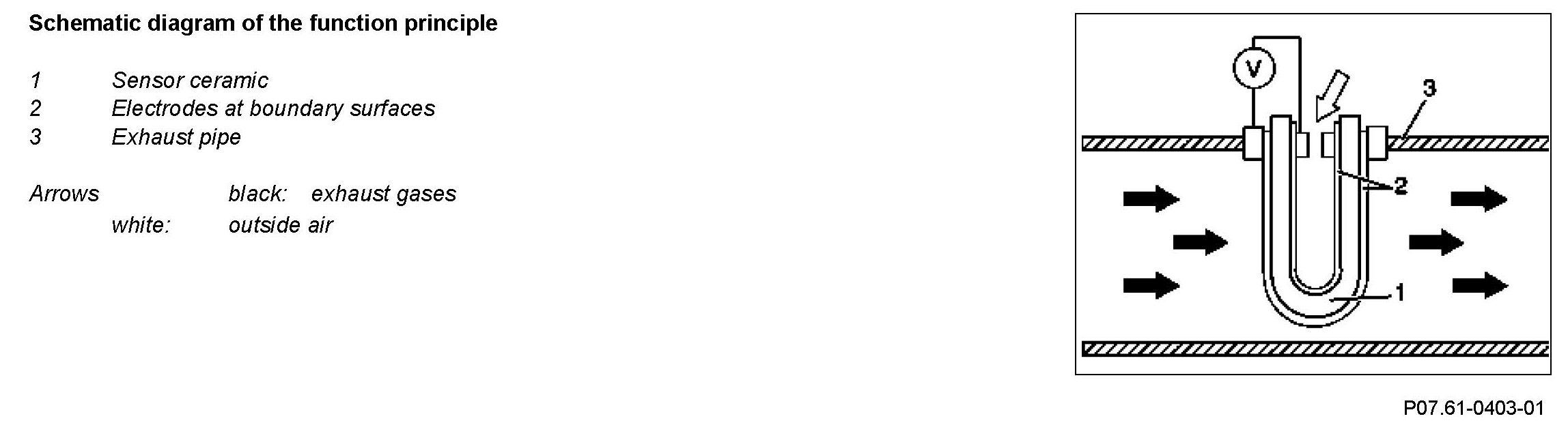 The sensor ceramic is conductive for oxygen ions from approx. 300 °C. If the oxygen concentration on both sides of the sensor ceramic differs, a signal voltage is produced at boundary surfaces as a result of particular properties of the sensor ceramic (Nernst voltage). This is the measure for the residual oxygen content in the exhaust.