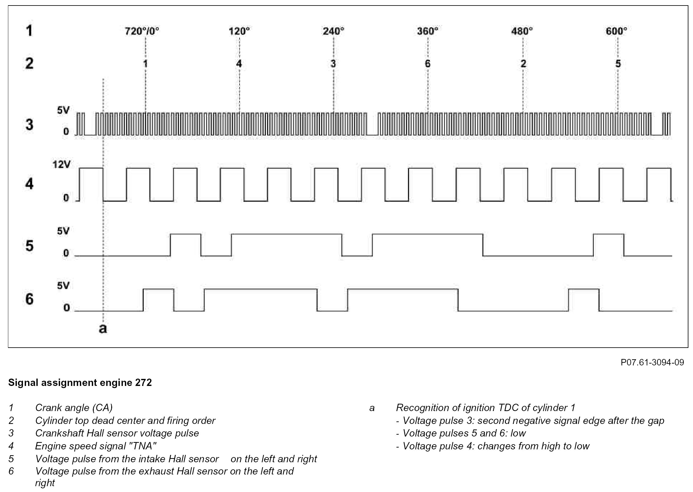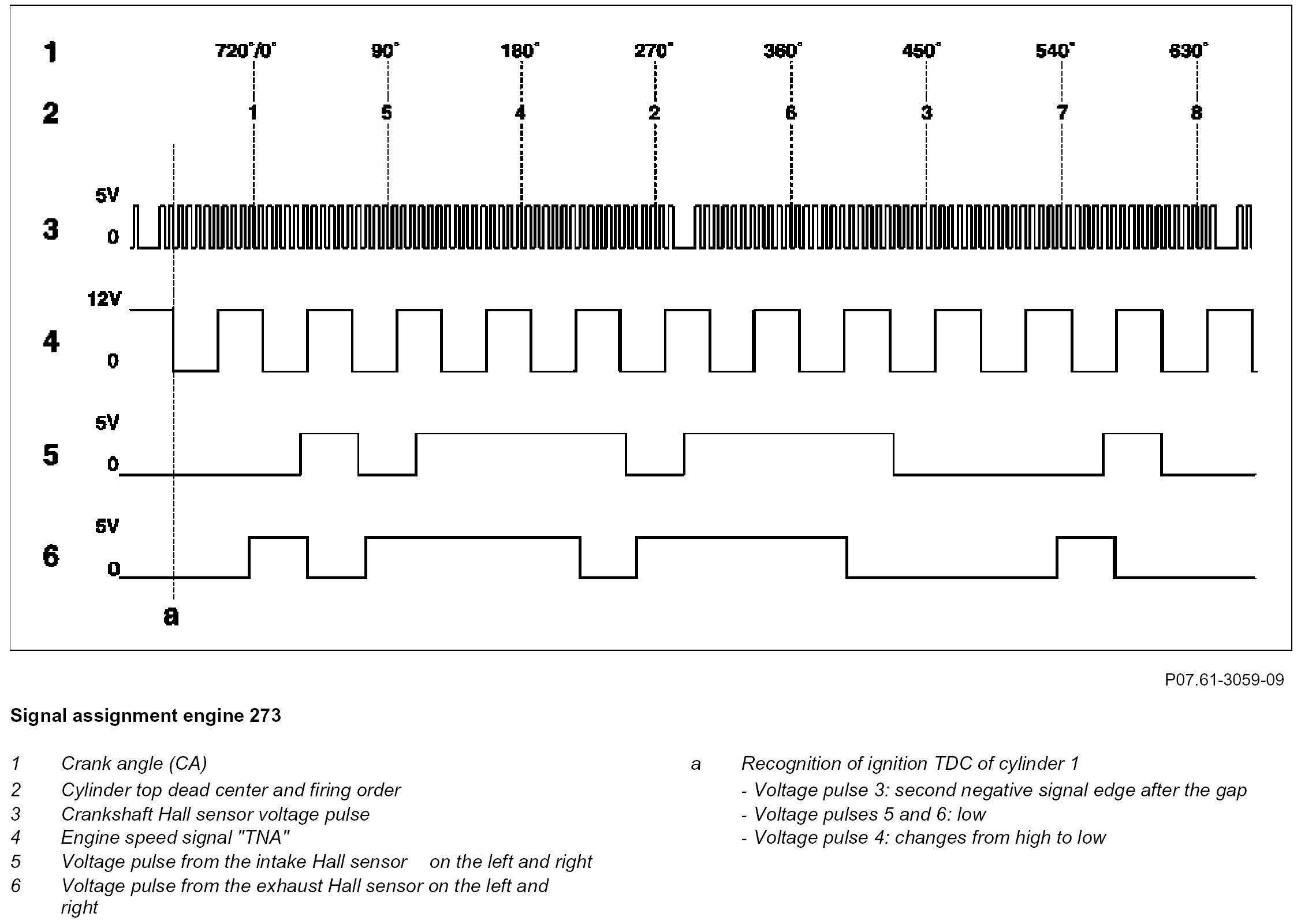 If the voltage pulse fails from the crankshaft Hall sensor, voltage pulses from the intake camshaft Hall sensors, on the left and right (B6/4, B6/5) are used instead (for limp-home mode) or used by the exhaust camshaft Hall sensors, on the left and right (B6/6, B6/7).