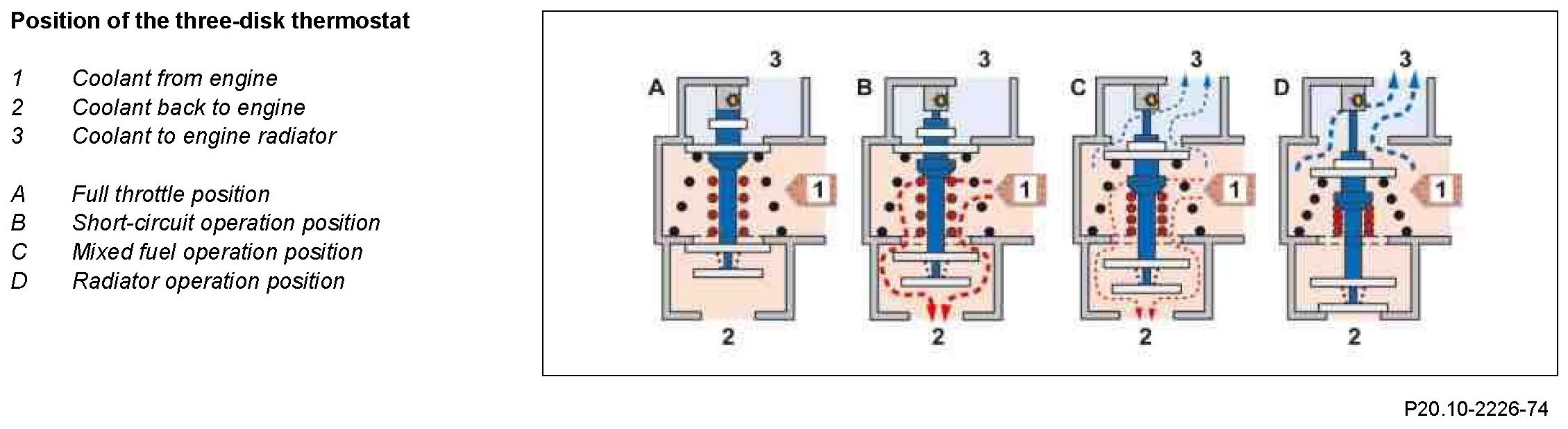 For mixed-fuel operation the three-disk thermostat is heated in such a way that the coolant flows through the engine radiator and the engine circuit.