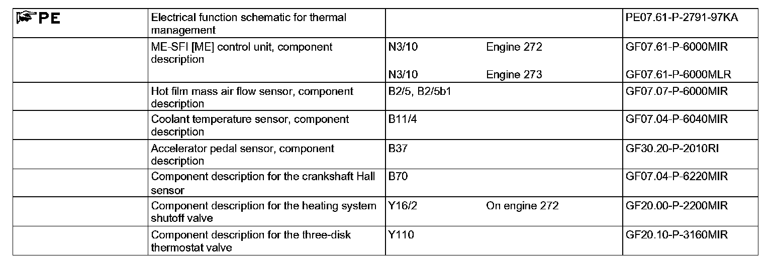 Depending on the operating conditions (performance map) the ME-SFI control unit actuates the heating element in the three-disk thermostat valve (Y110) with a ground signal. The voltage is supplied through "terminal 87 M2".