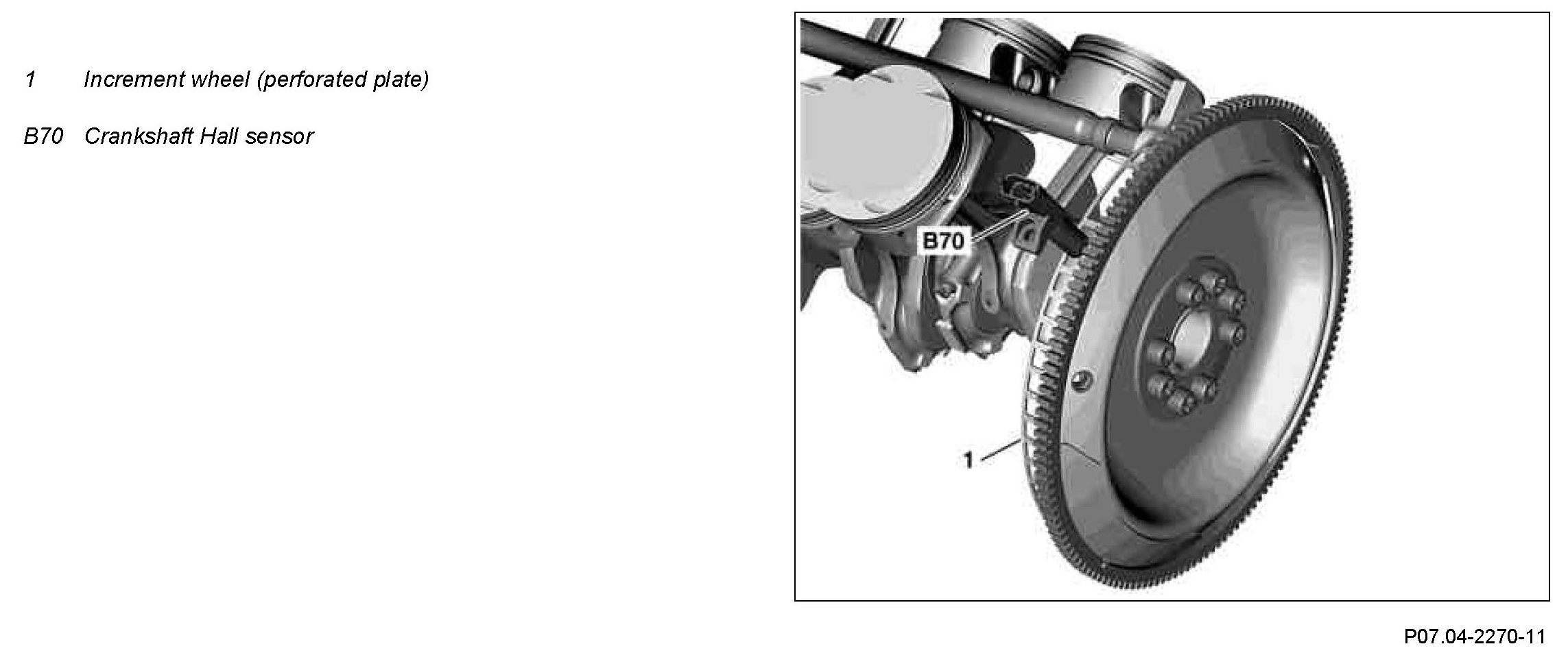 The Hall sensor contactlessly detects the position and rpm of the crankshaft over the increment wheel (perforated plate) on the starter ring gear.
