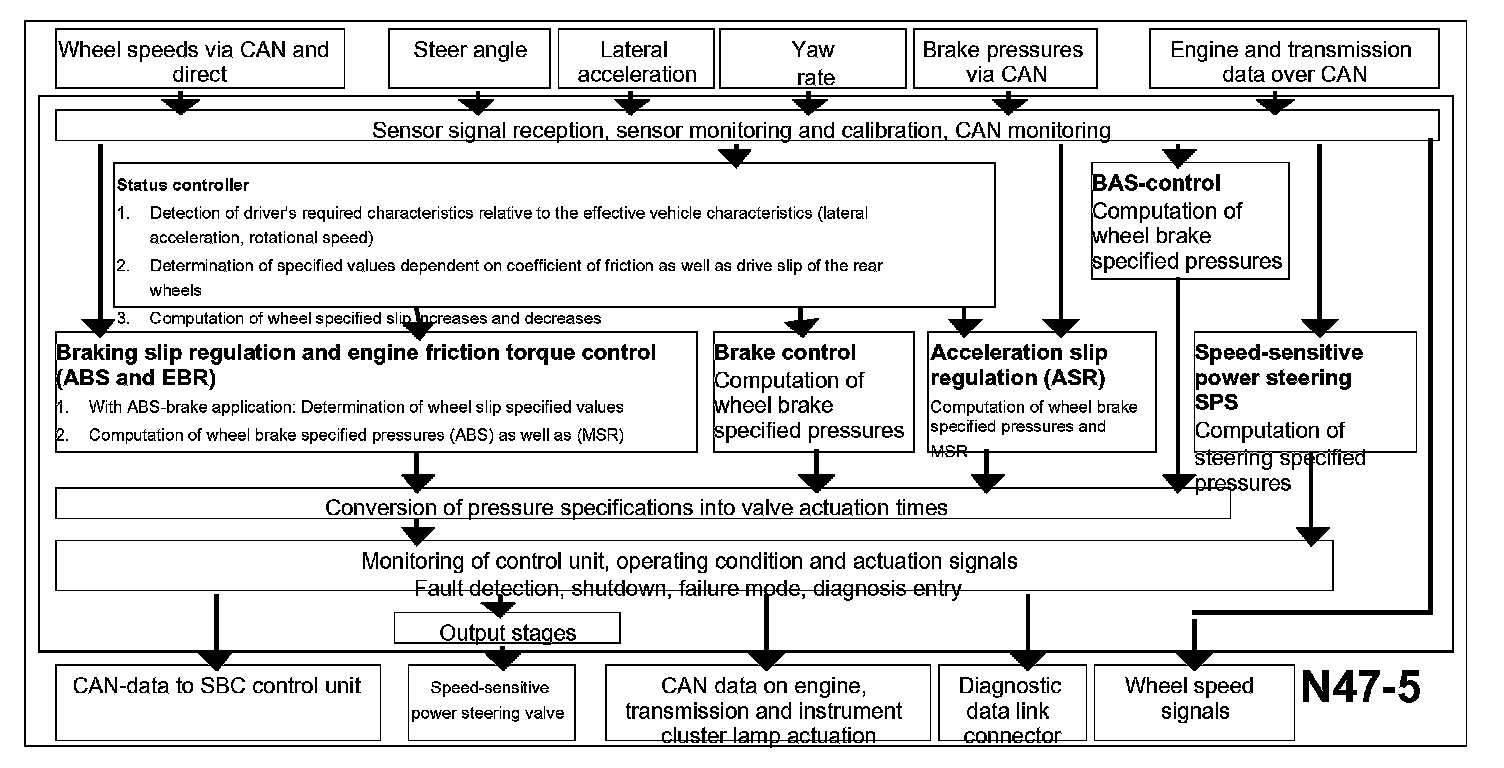 The ESP, SPS [PML] and BAS control unit (N47-5) is divided up functionally as follows: