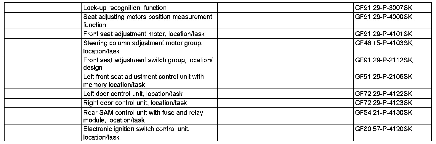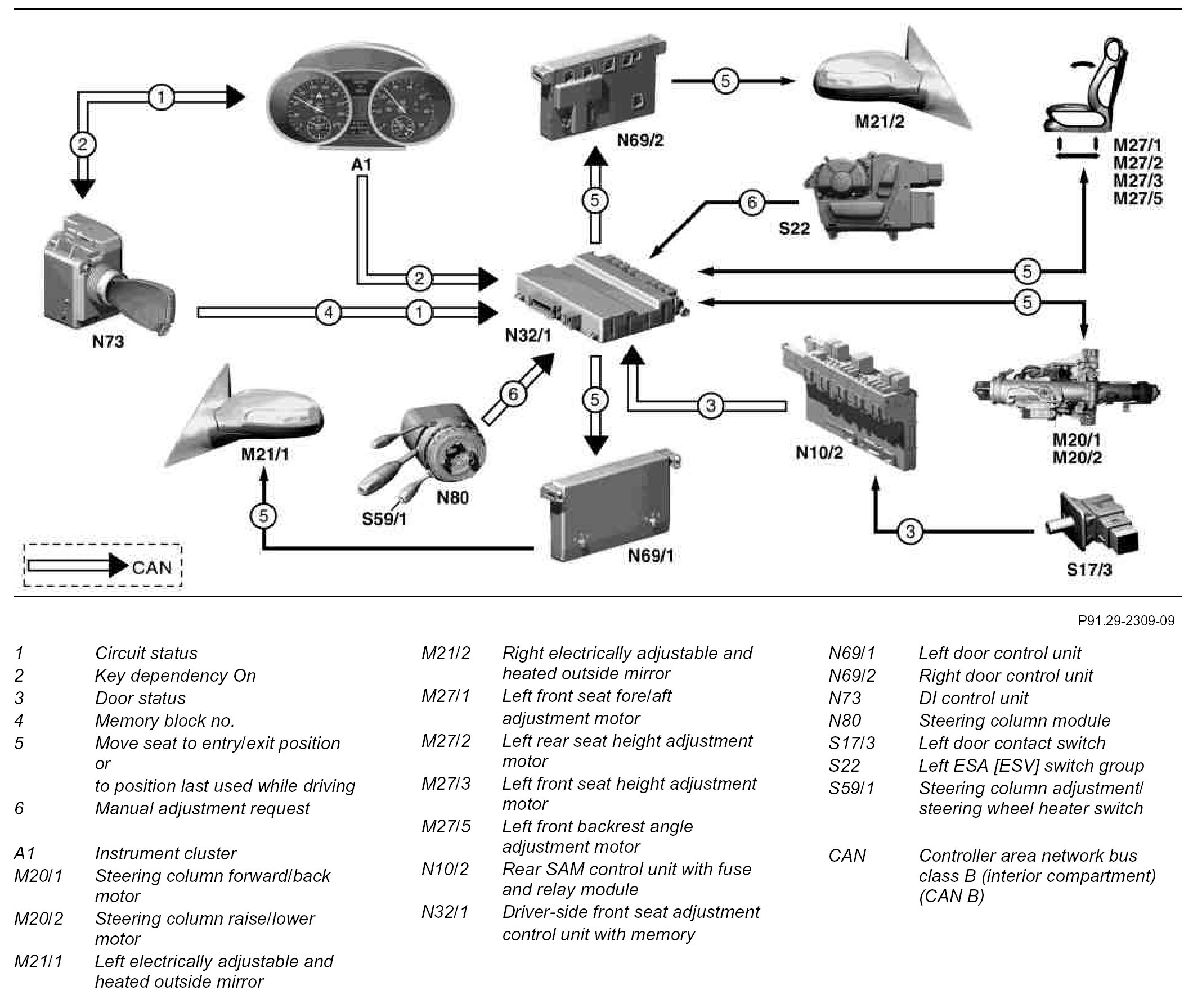 The driving position is stored in the driver-side front seat adjustment control unit with memory (N32/1) for that particular key. If the key is changed, a new driver seat driving position, steering column position, left electrically adjustable and heated outside mirror (M21/1) position and right electrically adjustable and heated outside mirror (M21/2) position are stored and assigned to the transmitter key.
