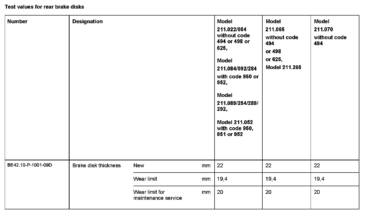 BE42.10-P-1000-09D Test values for rear brake disksModification Notes: