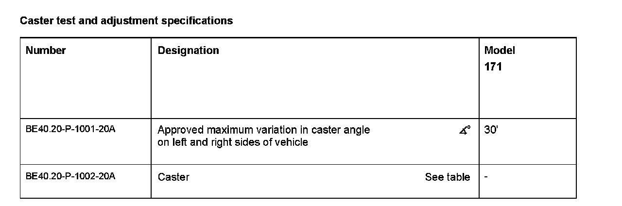 Caster angle tolerance range: ±30'