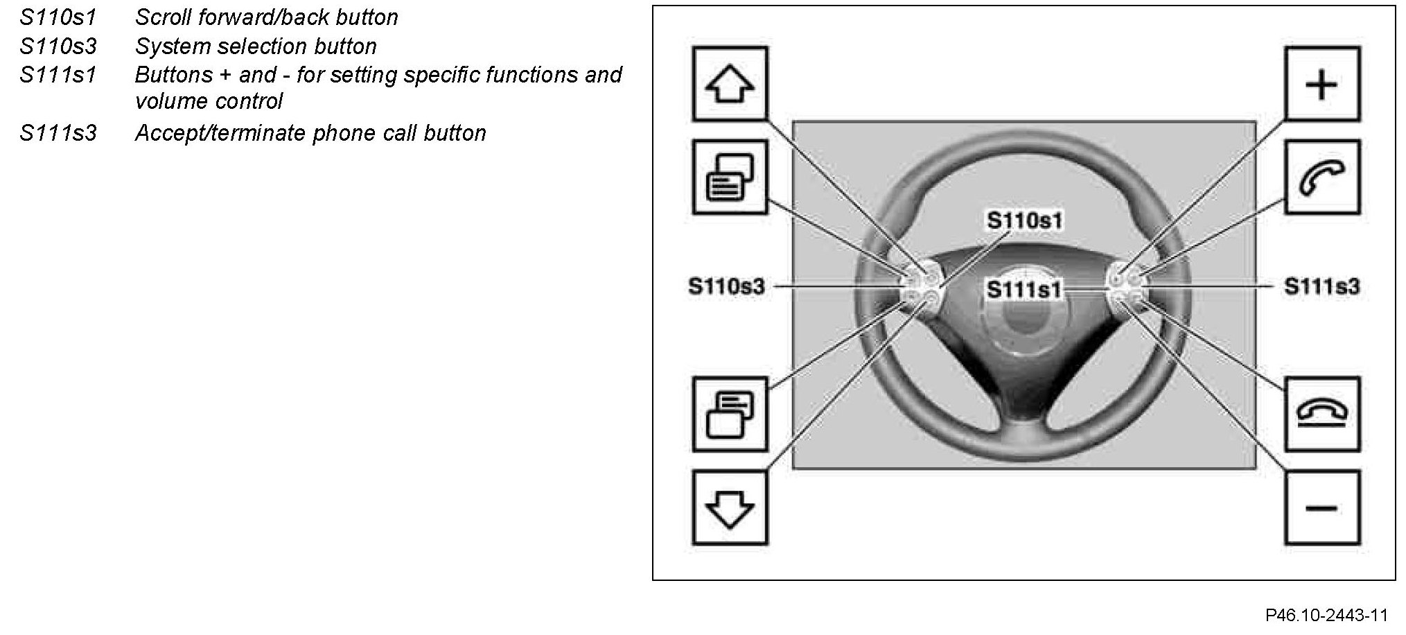 The right multifunction steering wheel button group contains the buttons + and - for setting specific functions and volume control (S111s1) and the accept/terminate phone call button (S111s3).
