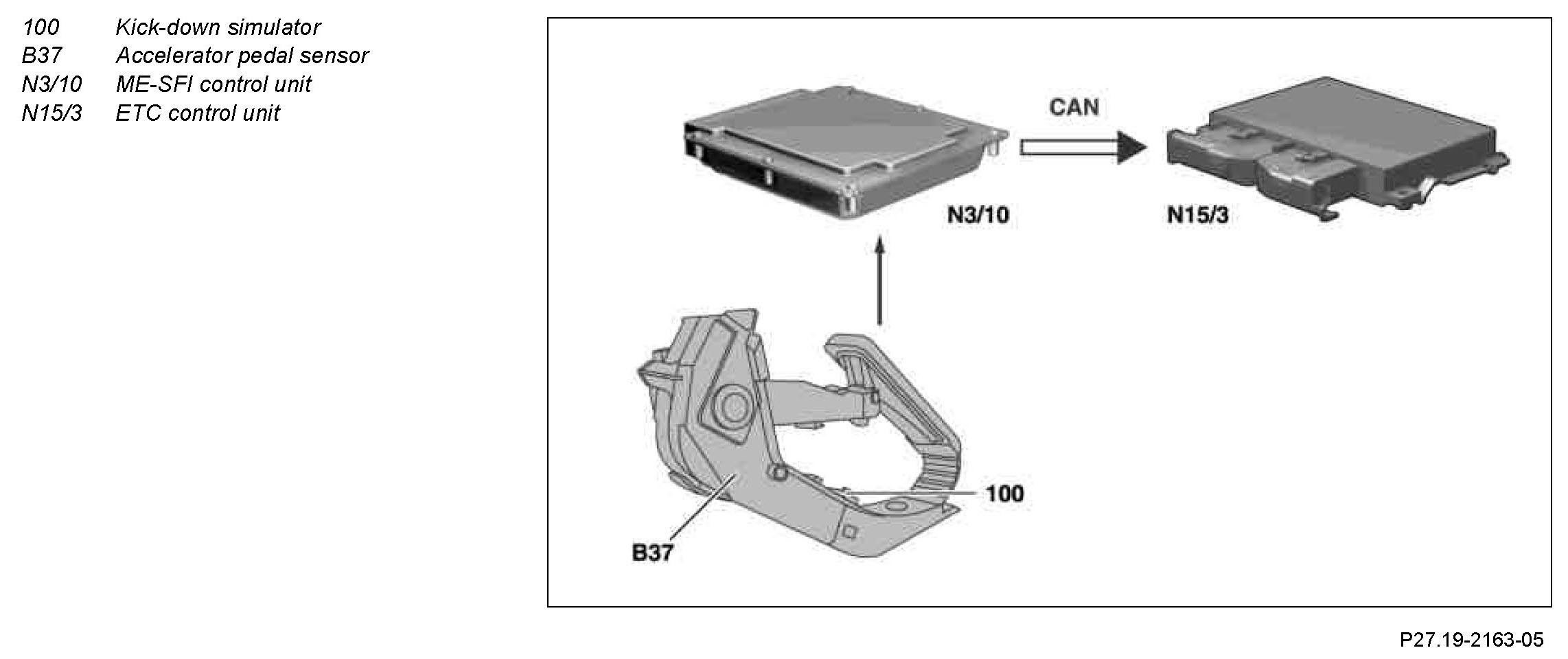 The kick down signal is recorded by the accelerator pedal sensor (B37) read in by the motor electronics control unit (N3/10) and passed on to the ETC [EGS] control unit (N15/3).