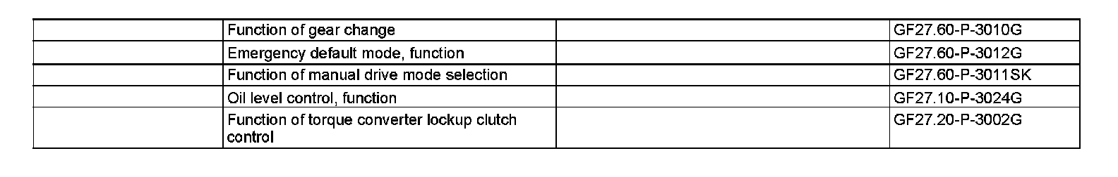 Selector lever position "P", "R", "N" and "D" are passed on mechanically to the range selector lever at the transmission end by means of a shift rod in parallel to conveying via the Controller Area Network bus class C (engine compartment) (CAN-C). Via touching or holding the selector lever towards "+" or "-" the shift range is preselected and displayed in the instrument cluster (A1) until an upshift of the transmission is possible.