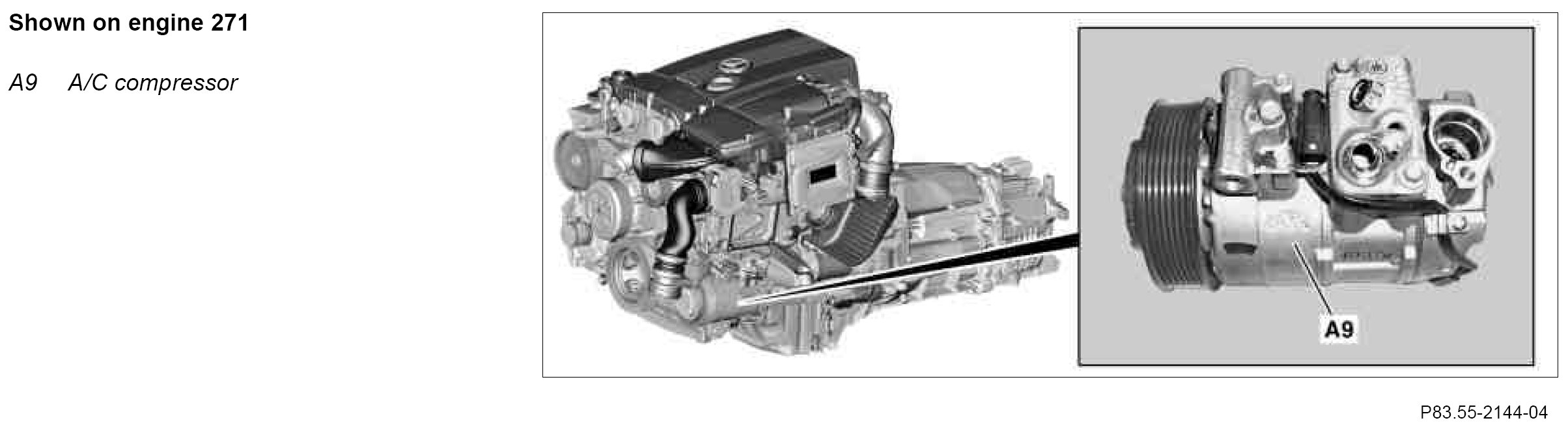 The refrigerant compressor is responsible for induction and compression of the refrigerant. The A/C compressor is continuously performance-controlled up to 100 % via the compressor control valve by the automatic air conditioning control and operating unit (N22/7). The control and operating unit sends the request for switching on via interior CAN (CAN B). The front SAM control unit with fuse and relay module (N10/1) receives the request and actuates the compressor control valve.