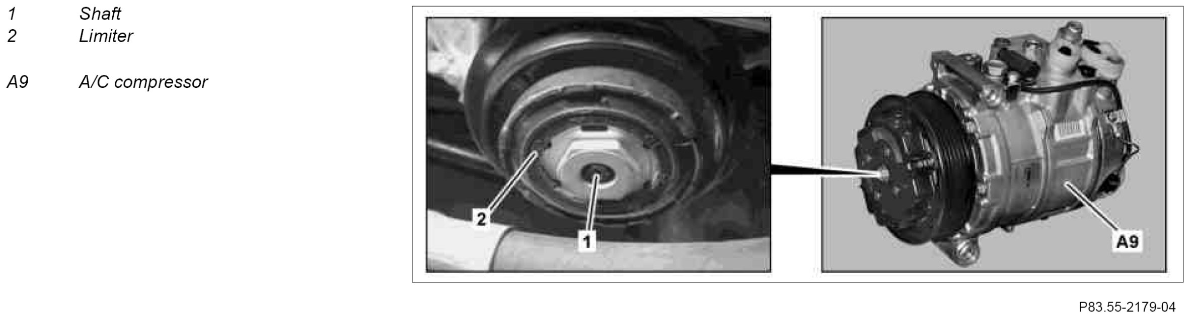 The A/C compressor is equipped with a limiter. This performs a protection function by means of torque limitation. Breakage of the limiter, e.g. with a stuck A/C compressor, ensures that the belt drive continues to function.