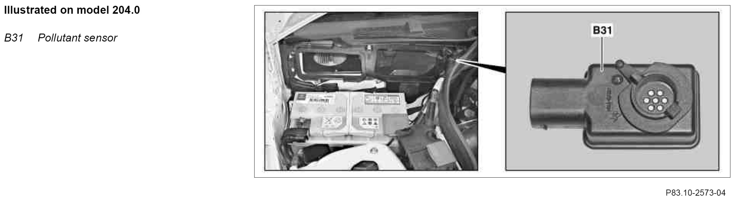 The pollutant sensor is located in the engine compartment beneath the wiper linkage to the left of the radiator tank.