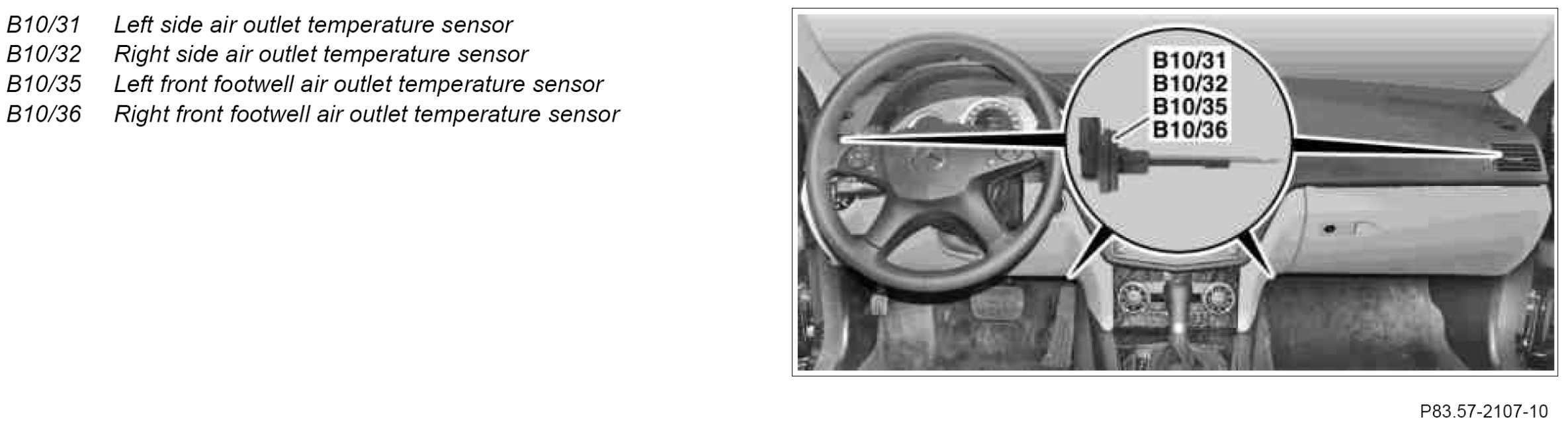 The side air vent air outlet temperature sensors are located in the relevant side air vent outlet openings. The footwell vent air outlet temperature sensors are located in the relevant footwell vent outlet openings.
