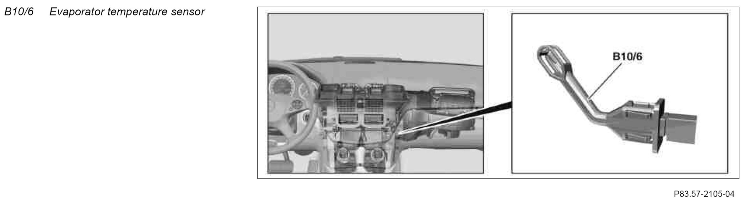 The evaporator temperature sensor records the temperature at the evaporator air outlet. To prevent the evaporator from icing up, the refrigerant compressor output (A9) is controlled accordingly.